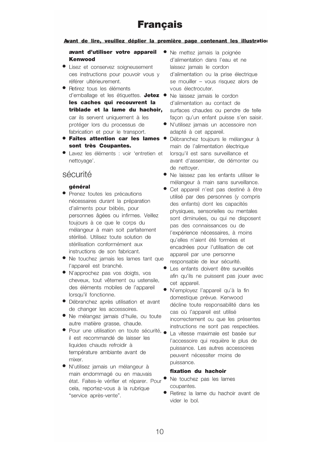 N’employez l’appareil qu’à la fin domestique prévue. Kenwood décline toute responsabilité dans les cas où l’appareil est utilisé incorrectement ou que les présentes instructions ne sont pas respectées.