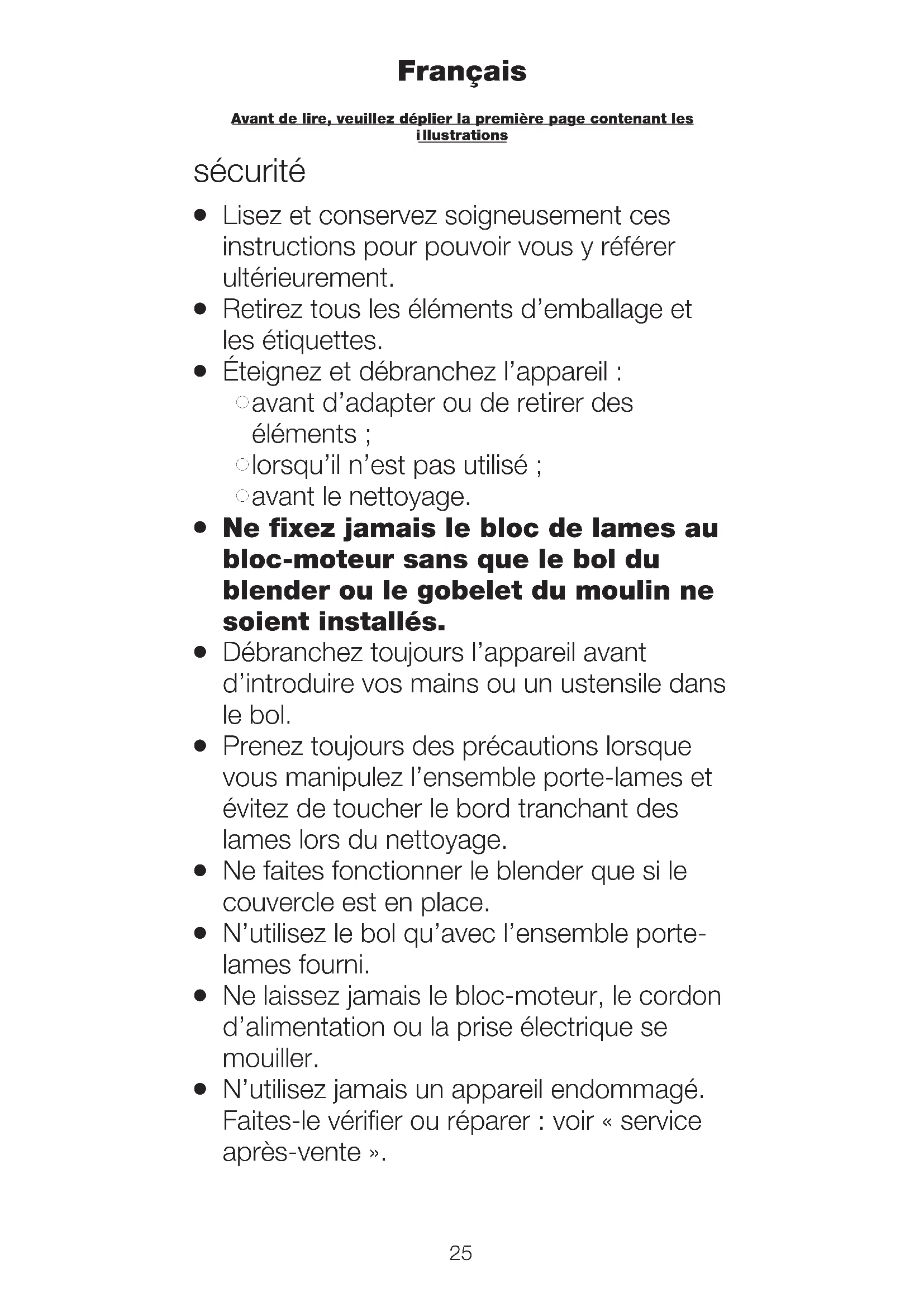 Ne faites jamais fonctionner le blender à vide.
