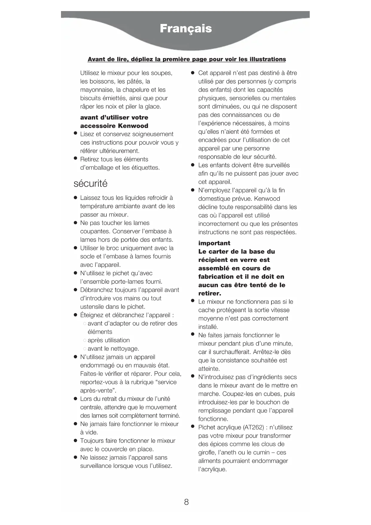 N’employez l’appareil qu’à la fin domestique prévue. Kenwood décline toute responsabilité dans les cas où l’appareil est utilisé incorrectement ou que les présentes instructions ne sont pas respectées. important Le carter de la base du récipient en verre est assemblé en cours de fabrication et il ne doit en aucun cas être tenté de le retirer.
