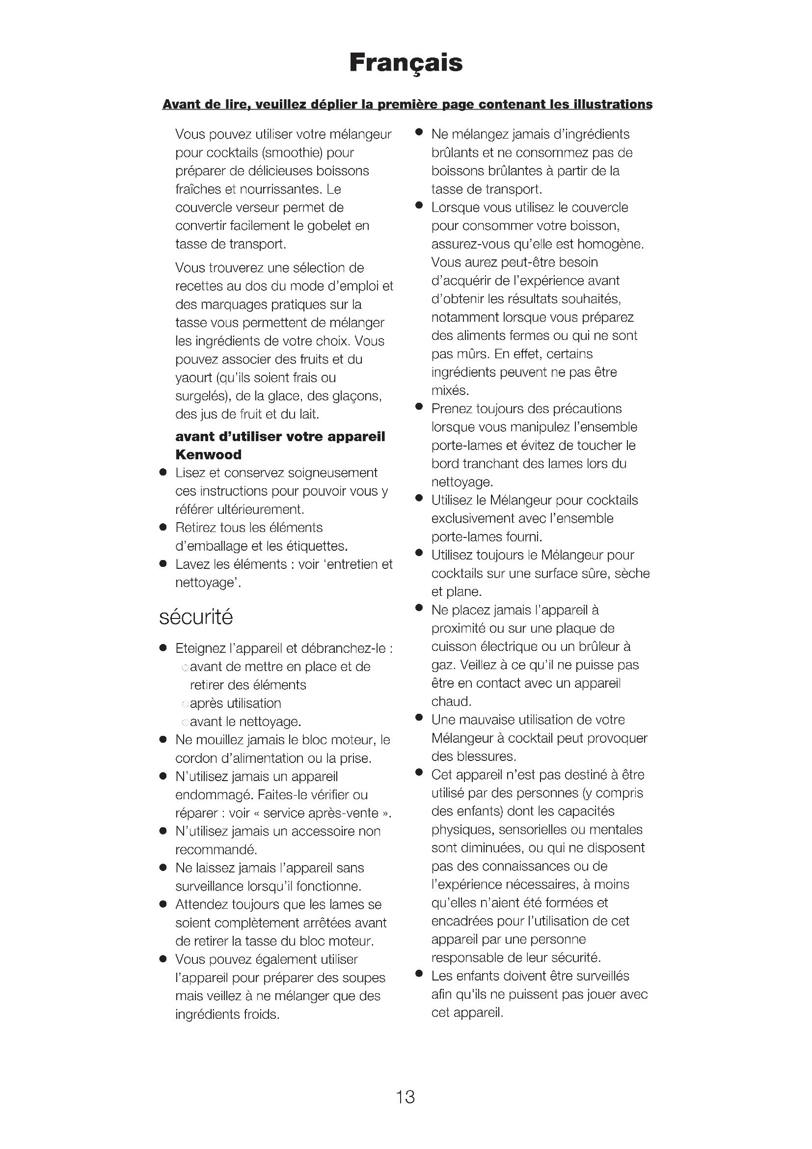 Avant de lire, veuillez déplier la première page contenant les illustrations Français● N’employez l’appareil qu’à la fin domestique prévue. Kenwood décline toute responsabilité dans les cas où l’appareil est utilisé incorrectement ou que les présentes instructions ne sont pas respectées. avant de brancher