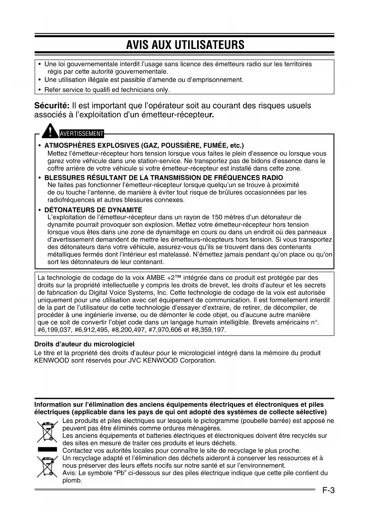 - DÉTONATEURS DE DYNAMITE L’exploitation de l’émetteur-récepteur dans un rayon de 150 mètres d’un détonateur de dynamite pourrait provoquer son explosion. Mettez votre émetteur-récepteur hors tension lorsque vous êtes dans une zone de dynamitage en cours ou dans un endroit où des panneaux d’avertissement demandent de mettre les émetteurs-récepteurs hors tension. Si vous transportez des détonateurs dans votre véhicule, assurez-vous qu’ils se trouvent dans des contenants métalliques fermés dont l’intérieur est matelassé. N’émettez jamais pendant qu’on place ou qu’on sort les détonnateurs de leur contenant. La technologie de codage de la voix AMBE +2™ intégrée dans ce produit est protégée par des droits sur la propriété intellectuelle y compris les droits de brevet, les droits d’auteur et les secrets de fabrication du Digital Voice Systems, Inc. Cette technologie de codage de la voix est autorisée uniquement pour une utilisation avec cet équipement de communication. Il est formellement interdit de la part de l’utilisateur de cette technologie d’essayer d’extraire, de retirer, de décompiler, de procéder à une ingénierie inverse, ou de démonter le code objet, ou d’aucune autre manière que ce soit de convertir l’objet code dans un langage humain intelligible. Brevets américains n°. #6,199,037, #6,912,495, #8,200,497, #7,970,606 et #8,359,197. Droits d’auteur du micrologiciel Le titre et la propriété des droits d’auteur pour le micrologiciel intégré dans la mémoire du produit KENWOOD sont réservés pour JVC KENWOOD Corporation. Information sur l’élimination des anciens équipements électriques et électroniques et piles électriques (applicable dans les pays de qui ont adopté des systèmes de collecte sélective) Les produits et piles électriques sur lesquels le pictogramme (poubelle barrée) est apposé ne peuvent pas être éliminés comme ordures ménagères. Les anciens équipements et batteries électriques et électroniques doivent être recyclés sur des sites en mesure de traiter ces produits et leurs déchets. Contactez vos autorités locales pour connaître le site de recyclage le plus proche. Un recyclage adapté et l’élimination des déchets aideront à conserver les ressources et à nous préserver des leurs effets nocifs sur notre santé et sur l’environnement. Avis: Le symbole “Pb” ci-dessous sur des piles électrique indique que cette pile contient du plomb.F-4 PRÉCAUTIONS Veuillez respecter les points suivants afi n d’éviter les risques d’incendie, de blessure corporelle ou d’endommagement de l’émetteur-récepteur.