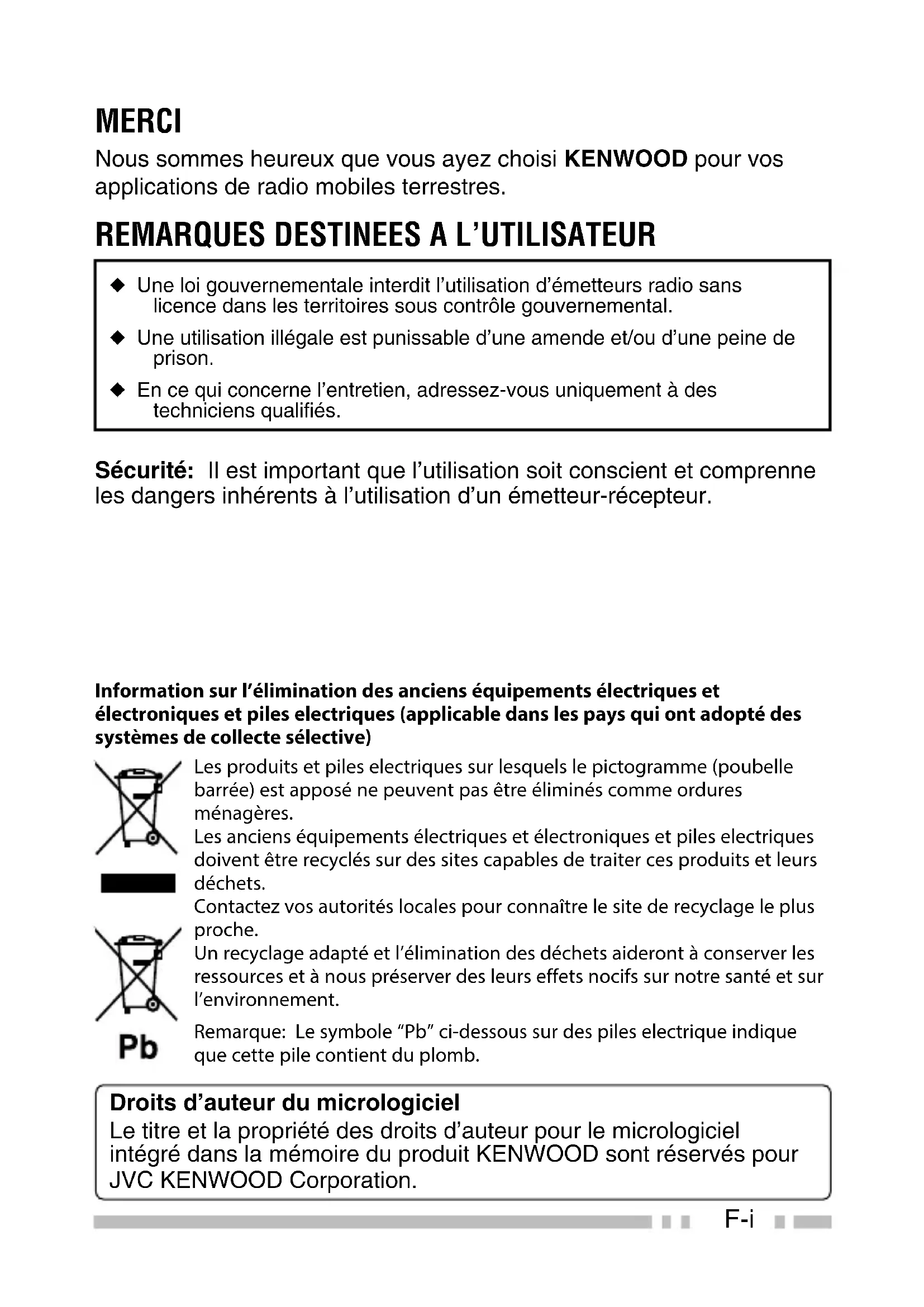 ◆ Une loi gouvernementale interdit l’utilisation d’émetteurs radio sans licence dans les territoires sous contrôle gouvernemental. ◆ Une utilisation illégale est punissable d’une amende et/ou d’une peine de prison. ◆ En ce qui concerne l’entretien, adressez-vous uniquement à des techniciens qualifiés. Sécurité: Il est important que l’utilisation soit conscient et comprenne les dangers inhérents à l’utilisation d’un émetteur-récepteur. Droits d’auteur du micrologiciel Le titre et la propriété des droits d’auteur pour le micrologiciel intégré dans la mémoire du produit KENWOOD sont réservés pour JVC KENWOOD Corporation. Information sur l’élimination des anciens équipements électriques et électroniques et piles electriques (applicable dans les pays qui ont adopté des systèmes de collecte sélective) Les produits et piles electriques sur lesquels le pictogramme (poubelle barrée) est apposé ne peuvent pas être éliminés comme ordures ménagères. Les anciens équipements électriques et électroniques et piles electriques doivent être recyclés sur des sites capables de traiter ces produits et leurs déchets. Contactez vos autorités locales pour connaître le site de recyclage le plus proche. Un recyclage adapté et l’élimination des déchets aideront à conserver les ressources et à nous préserver des leurs effets nocifs sur notre santé et sur l’environnement. Remarque: Le symbole “Pb” ci-dessous sur des piles electrique indique que cette pile contient du plomb.F-ii PRÉCAUTIONS