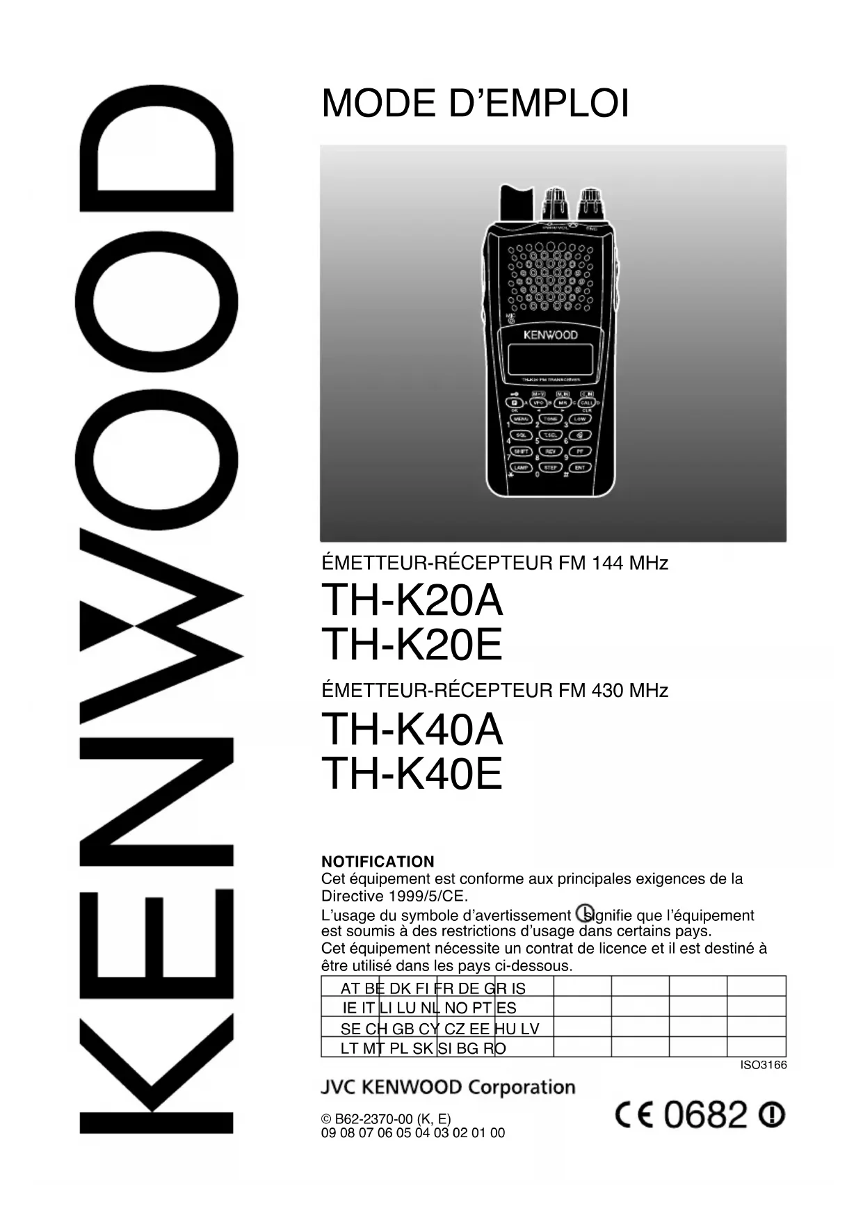 TH-K40A TH-K40E ÉMETTEUR-RÉCEPTEUR FM 430 MHz ÉMETTEUR-RÉCEPTEUR FM 144 MHz TH-K20A TH-K20E NOTIFICATION Cet équipement est conforme aux principales exigences de la Directive 1999/5/CE. L’usage du symbole d’avertissement signifie que l’équipement est soumis à des restrictions d’usage dans certains pays. Cet équipement nécessite un contrat de licence et il est destiné à être utilisé dans les pays ci-dessous. AT BE DK FI FR DE GR IS IE IT LI LU NL NO PT ES SE CH GB CY CZ EE HU LV LT MT PL SK SI BG RO ISO3166F-i Information sur l’élimination des anciens équipements électriques et électroniques et piles electriques (applicable dans les pays de l’Union Européenne qui ont adopté des systèmes de collecte sélective) Les produits et piles electriques sur lesquels le pictogramme (poubelle barrée) est apposé ne peuvent pas être éliminés comme ordures ménagères. Les anciens équipements électriques et électroniques et piles electriques doivent être recyclés sur des sites capables de traiter ces produits et leurs déchets. Contactez vos autorités locales pour connaître le site de recyclage le plus proche. Un recyclage adapté et l’élimination des déchets aideront à conserver les ressources et à nous préserver des leurs effets nocifs sur notre santé et sur l’environnement. Remarque: Le symbole "Pb" ci-dessous sur des piles electrique indique que cette pile contient du plomb. Droits d’auteur du micrologiciel Le titre et la propriété des droits d’auteur pour le micrologiciel intégré dans la mémoire du produit KENWOOD sont réservés pour JVC KENWOOD Corporation. Le présent appareil est conforme aux CNR d’Industrie Canada applicables aux appareils radio exempts de licence. L’exploitation est autorisée aux deux conditions suivantes : (1) l’appareil ne doit pas produire de brouillage, et (2) l’utilisateur de l’appareil doit accepter tout brouillage radioélectrique subi, même si le brouillage est susceptible d’en compromettre le fonctionnement. MERCI Nous vous remercions d’avoir décidé d’acheter cet émetteur-récepteur FM KENWOOD. KENWOOD fournit toujours des produits amateur radio qui surprennent et enthousiasment les passionnés les plus sérieux. Cet émetteur-récepteur n’est pas une exception. KENWOOD est confiant que ce produit satisfera vos exigences en matière de communication vocale.