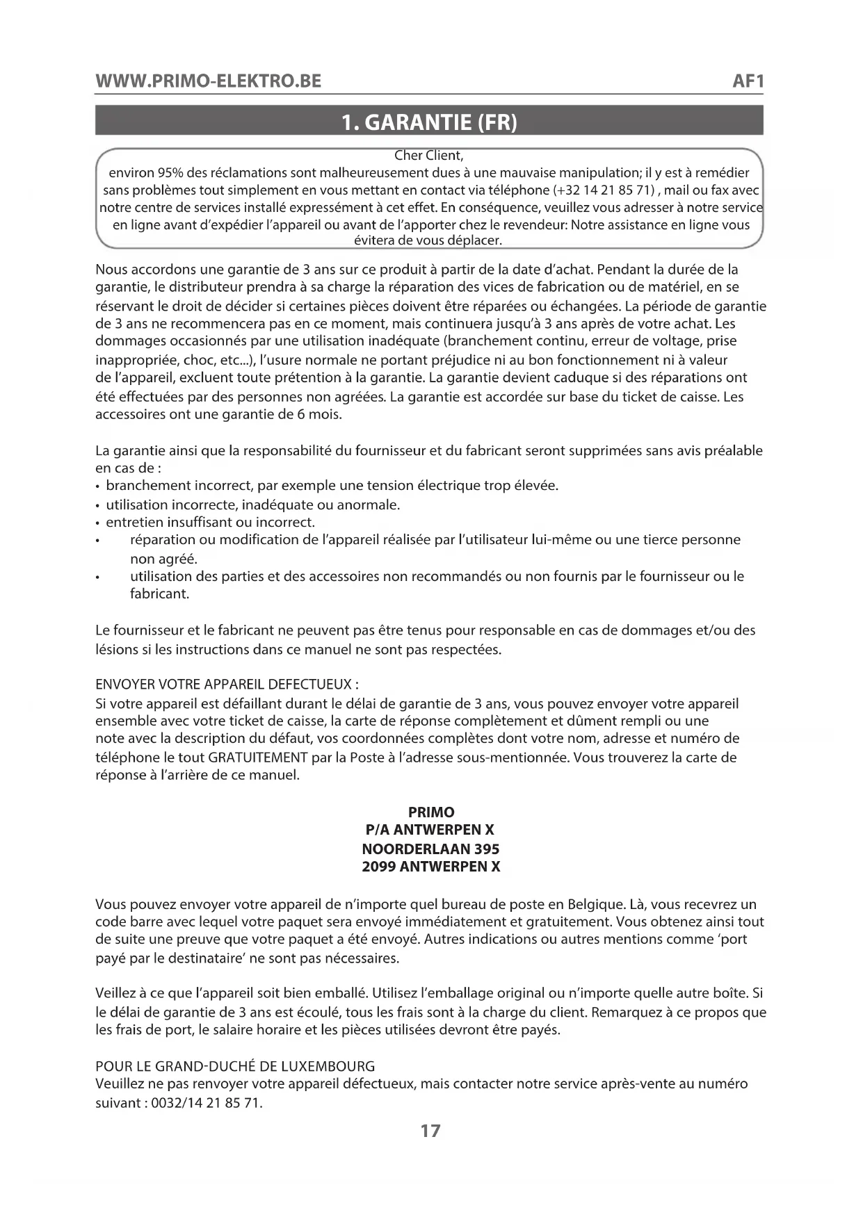 Veuillez ne pas renvoyer votre appareil défectueux, mais contacter notre service après-vente au numéro suivant : 0032/14 21 85 71.AF1