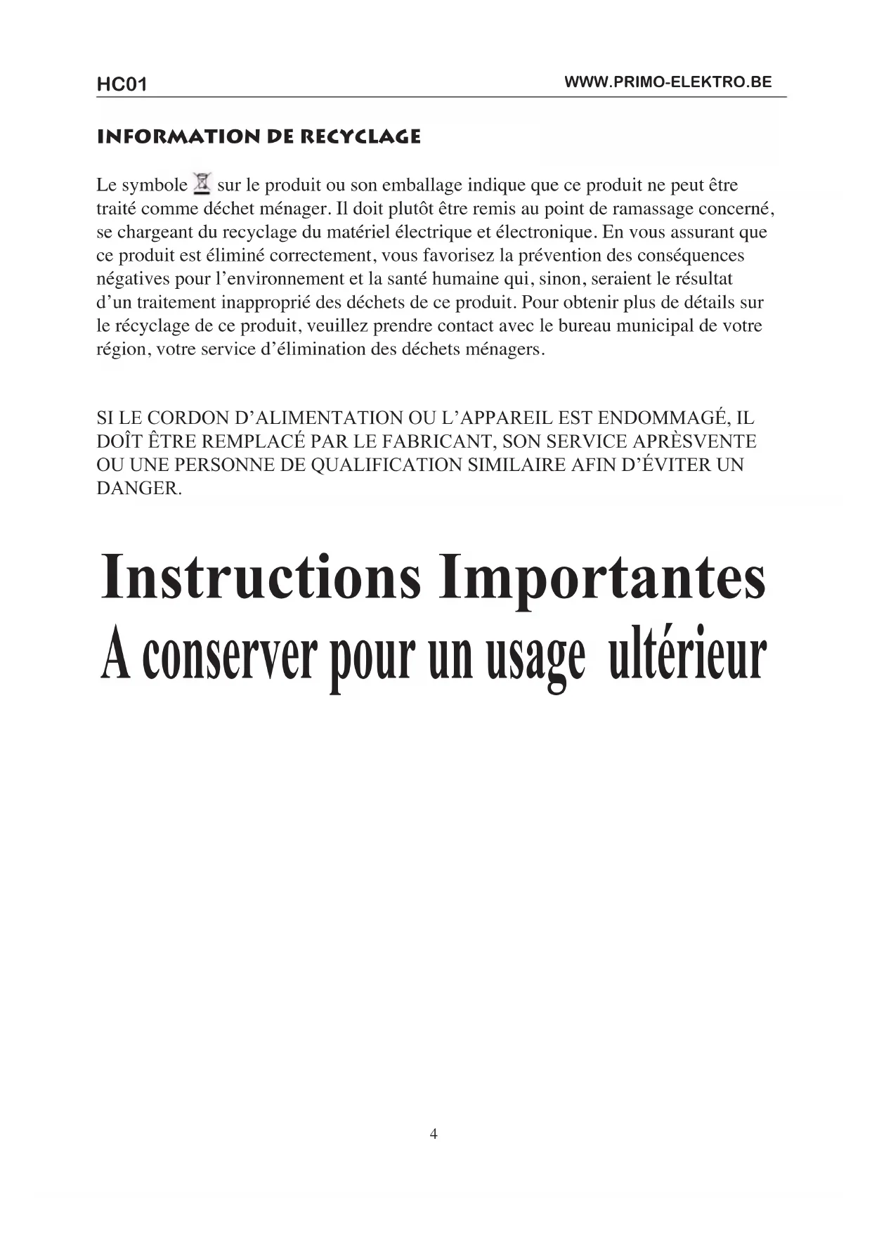 Le symbole sur le produit ou son emballage indique que ce produit ne peut être traité comme déchet ménager. Il doit plutôt être remis au point de ramassage concerné, se chargeant du recyclage du matériel électrique et électronique. En vous assurant que ce produit est éliminé correctement, vous favorisez la prévention des conséquences négatives pour l’environnement et la santé humaine qui, sinon, seraient le résultat d’un traitement inapproprié des déchets de ce produit. Pour obtenir plus de détails sur le récyclage de ce produit, veuillez prendre contact avec le bureau municipal de votre région, votre service d’élimination des déchets ménagers. SI LE CORDON D’ALIMENTATION OU L’APPAREIL EST ENDOMMAGÉ, IL DOÎT ÊTRE REMPLACÉ PAR LE FABRICANT, SON SERVICE APRÈSVENTE OU UNE PERSONNE DE QUALIFICATION SIMILAIRE AFIN D’ÉVITER UN DANGER. Instructions Importantes A conserver pour un usage ultérieurHC01