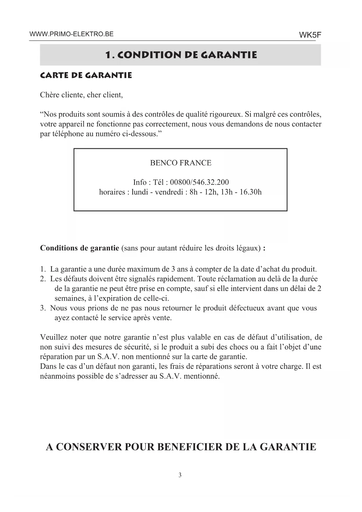 A CONSERVER POUR BENEFICIER DE LA GARANTIE