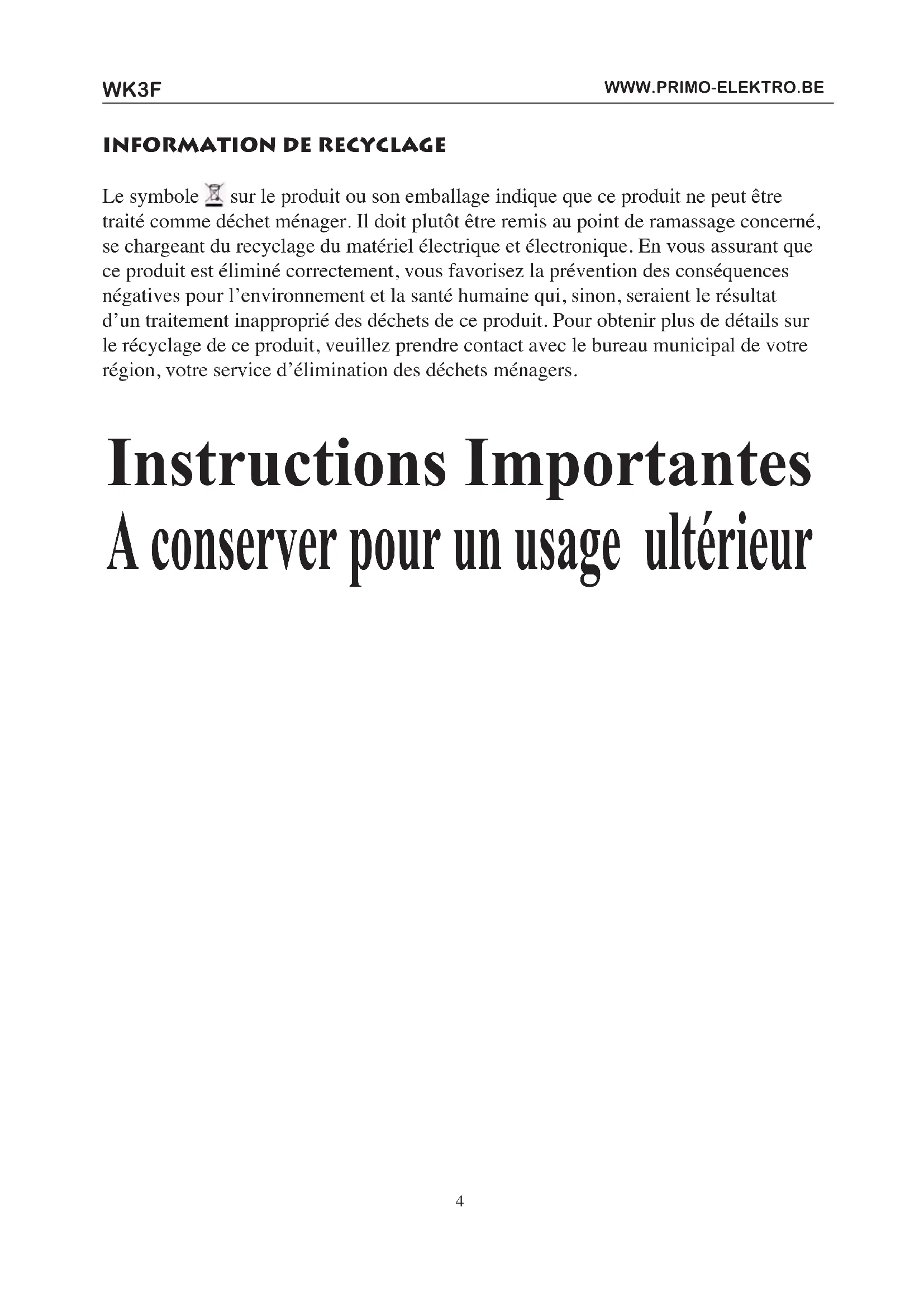 Le symbole sur le produit ou son emballage indique que ce produit ne peut être traité comme déchet ménager. Il doit plutôt être remis au point de ramassage concerné, se chargeant du recyclage du matériel électrique et électronique. En vous assurant que ce produit est éliminé correctement, vous favorisez la prévention des conséquences négatives pour l’environnement et la santé humaine qui, sinon, seraient le résultat d’un traitement inapproprié des déchets de ce produit. Pour obtenir plus de détails sur le récyclage de ce produit, veuillez prendre contact avec le bureau municipal de votre région, votre service d’élimination des déchets ménagers. Instructions Importantes A conserver pour un usage ultérieurWK3F