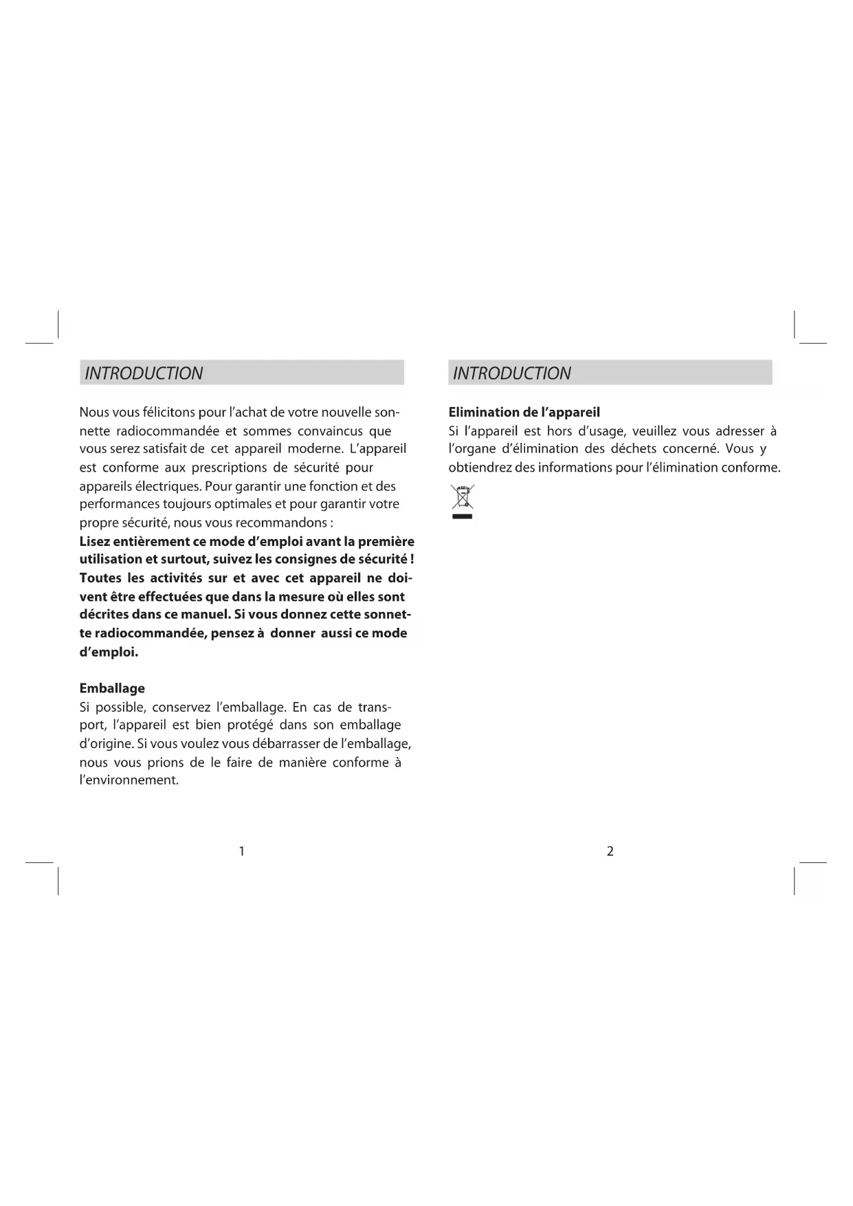 Lisez entiement ce mode d'emploi avant la première utilisation et sur tout, suivez les consignes de sécurité! Toutes les activités sur et avec cet apparéil ne doivent être effectuees que dans la mesure ou elles sont décrites dans ce manuel. Si vous donnez cette sonnette radiocommandée, pensez à donner aussi ce mode d'emploi.