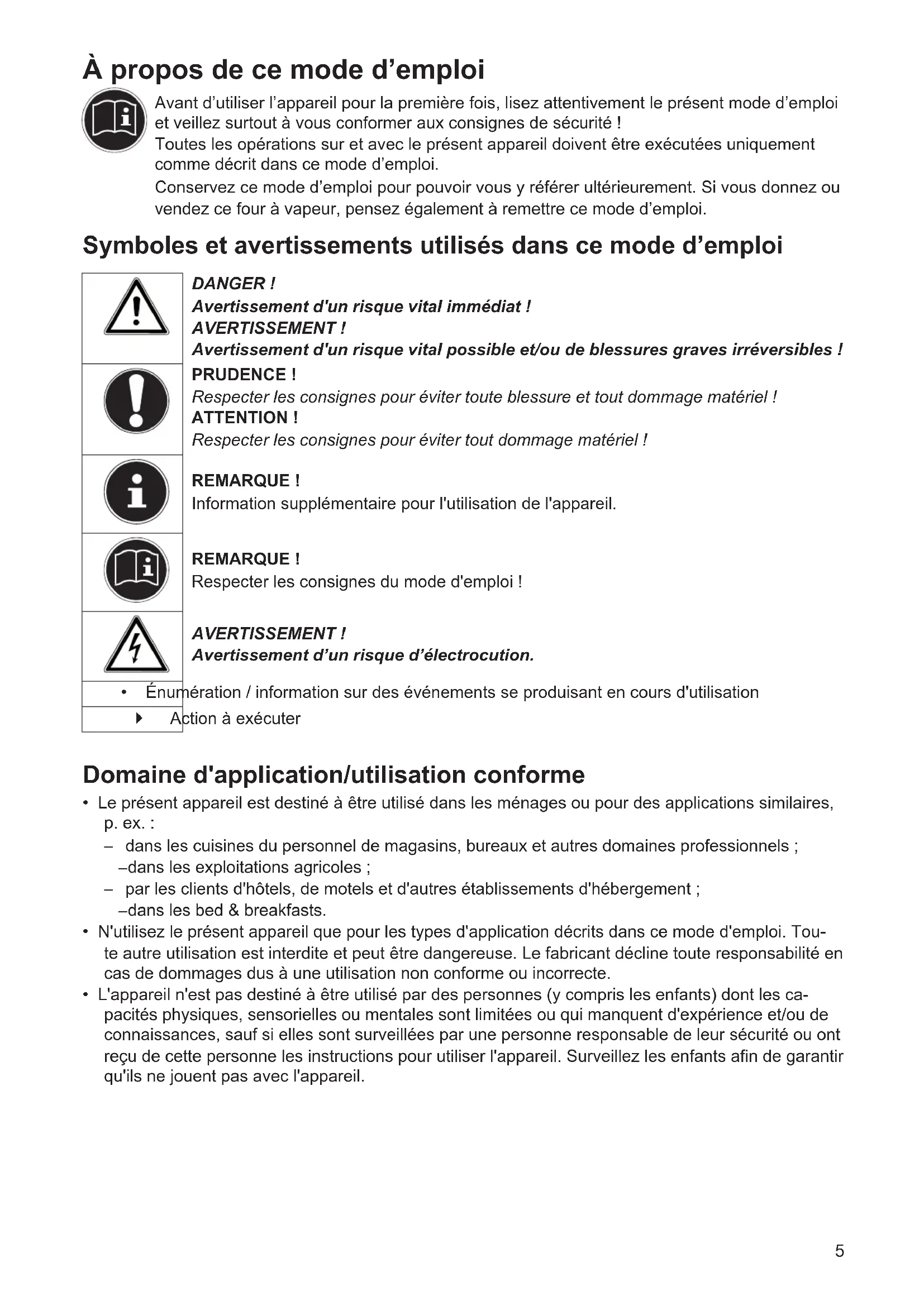 - Domaine d'application/utilisation conforme p. 5