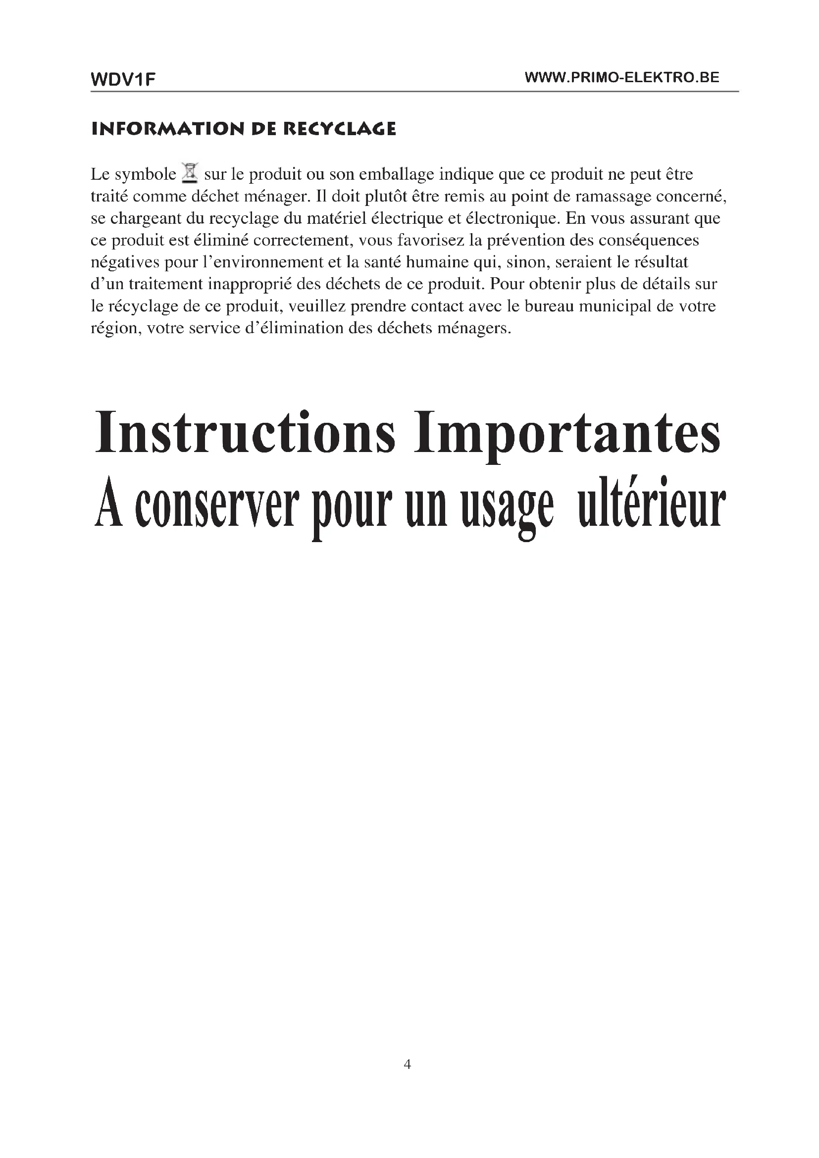 Le symbole sur le produit ou son emballage indique que ce produit ne peut être traité comme déchet ménager. Il doit plutôt être remis au point de ramassage concerné, se chargeant du recyclage du matériel électrique et électronique. En vous assurant que ce produit est éliminé correctement, vous favorisez la prévention des conséquences négatives pour l’environnement et la santé humaine qui, sinon, seraient le résultat d’un traitement inapproprié des déchets de ce produit. Pour obtenir plus de détails sur le récyclage de ce produit, veuillez prendre contact avec le bureau municipal de votre région, votre service d’élimination des déchets ménagers. Instructions Importantes A conserver pour un usage ultérieurWDV1F