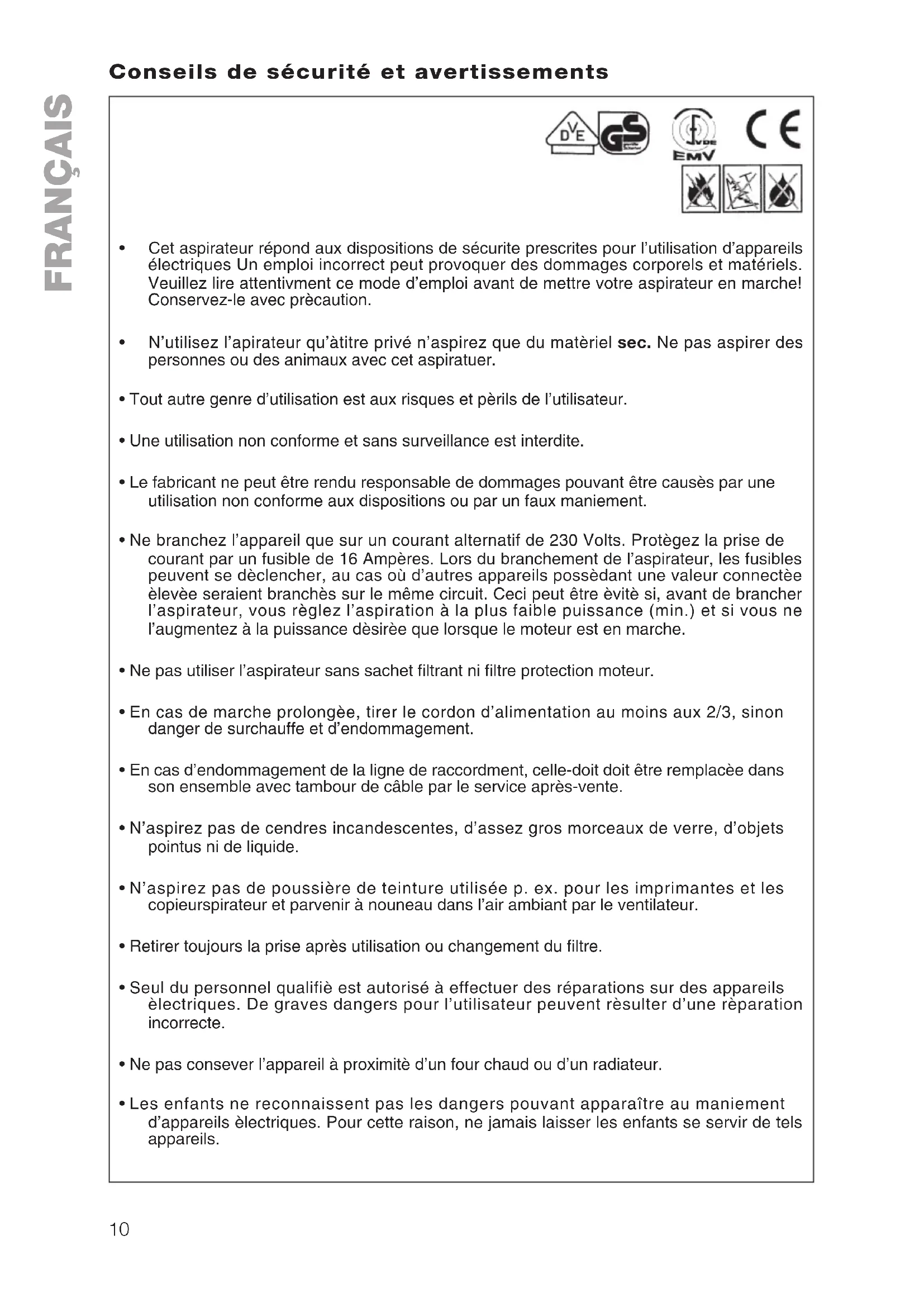 - Cet aspirateur répond aux dispositions de sécurite prescrites pour l’utilisation d’appareils électriques Un emploi incorrect peut provoquer des dommages corporels et matériels. Veuillez lire attentivment ce mode d’emploi avant de mettre votre aspirateur en marche! Conservez-le avec prècaution.