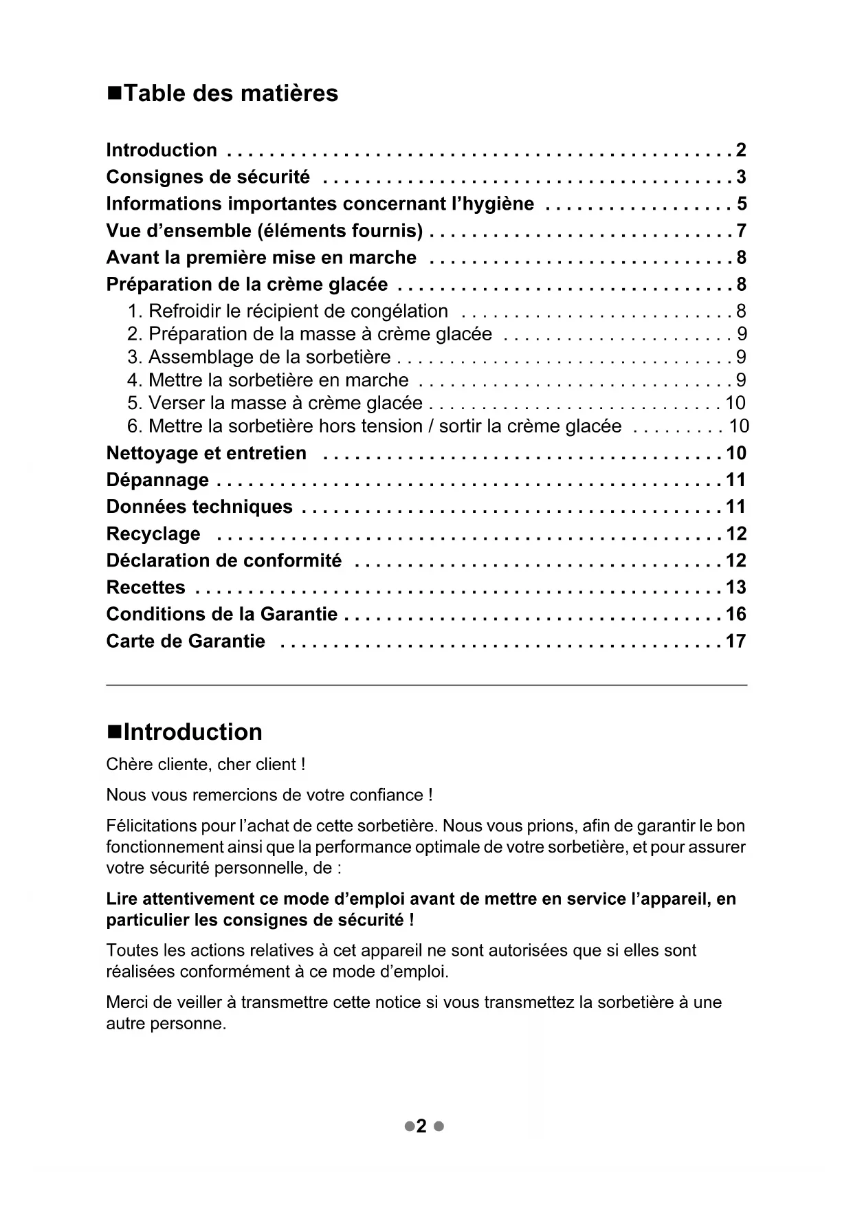 d’emploi, une sélection de recettes déjà testées avec cette sorbetière.