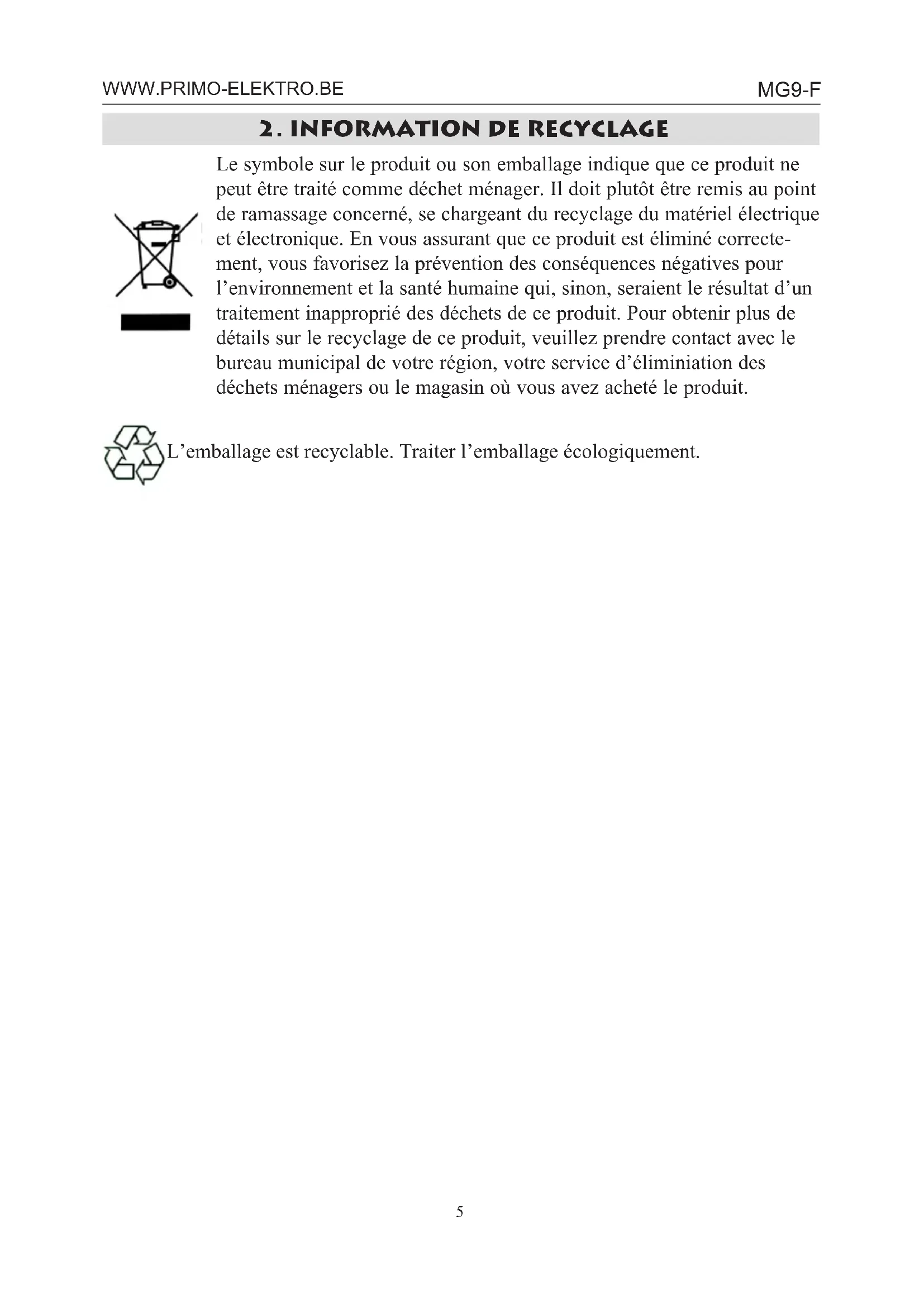 Le symbole sur le produit ou son emballage indique que ce produit ne peut être traité comme déchet ménager. Il doit plutôt être remis au point de ramassage concerné, se chargeant du recyclage du matériel électrique et électronique. En vous assurant que ce produit est éliminé correcte- ment, vous favorisez la prévention des conséquences négatives pour l’environnement et la santé humaine qui, sinon, seraient le résultat d’un traitement inapproprié des déchets de ce produit. Pour obtenir plus de détails sur le recyclage de ce produit, veuillez prendre contact avec le bureau municipal de votre région, votre service d’éliminiation des déchets ménagers ou le magasin où vous avez acheté le produit. L’emballage est recyclable. Traiter l’emballage écologiquement.MG9-F