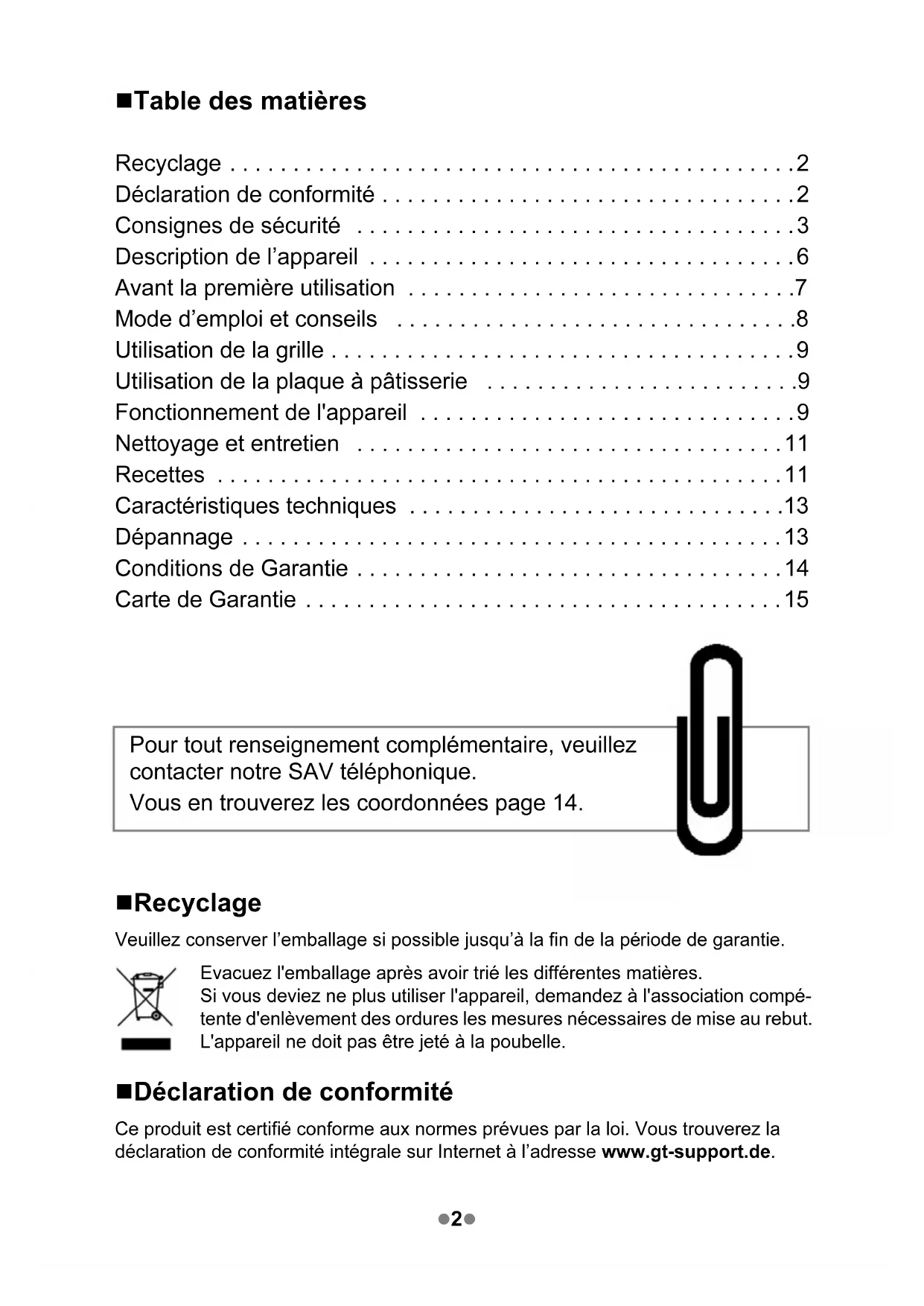 - Carte de Garantie Pour tout renseignement complémentaire, veuillez contacter notre SAV téléphonique. Vous en trouverez les coordonnées page 14. Recyclage Veuillez conserver l’emballage si possible jusqu’à la fin de la période de garantie. Evacuez l'emballage après avoir trié les différentes matières. Si vous deviez ne plus utiliser l'appareil, demandez à l'association compé- tente d'enlèvement des ordures les mesures nécessaires de mise au rebut. L'appareil ne doit pas être jeté à la poubelle. Déclaration de conformité Ce produit est certifié conforme aux normes prévues par la loi. Vous trouverez la déclaration de conformité intégrale sur Internet à l’adresse www.gt-support.de. E45302 FR Miniofen.book Seite 2 Dienstag, 16. Oktober 2012 11:38 11 3 Consignes de sécurité Pour votre sécurité, lisez attentivement le présent mode d’emploi et conser- vez-le pour pouvoir le consulter ultérieurement. En cas de cession de l’appa- reil, veillez à remettre également le mode d’emploi. Utilisation conforme Ce mini-four est conçu exclusivement pour réchauffer, cuire, griller et déconge- ler des aliments. Le four ne doit pas être utilisé pour sécher des objets. Il est interdit de placer des êtres vivants dans ou sur l’appareil ! Cet appareil est prévu pour un usage ménager et conçu pour traiter les quantités généralement requises dans ce cadre. Le mini-four ne convient pas pour une utilisation professionnelle ou assimilée à un usage ménager dans les cuisines destinées aux employés dans les magasins, les bureaux et autres locaux profes- sionnels, dans les exploitations agricoles, par les clients dans les hôtels, motels et autres locaux d’hébergement ou dans les chambres d‘hôtes. Le mini-four doit être utilisé uniquement à l’intérieur et ne peut être encastré. Utilisez l’appareil uniquement selon les instructions contenues dans la présente notice. Toute autre utilisation est considérée comme non conforme à l’usage prévu et peut provoquer des dommages ou même des blessures. Le fabricant décline toute responsabilité pour les dommages qui seraient dus à une utilisation non conforme. Sécurité des enfants et de l’entourage Cet appareil n’est pas destiné à être utilisé par des personnes (y compris les enfants) qui souffrent de capacités physiques, sensorielles ou mentales réduites ou qui manquent d’expérience et/ou de connaissances, sauf si elles sont surveillées par une personne responsable de leur sécurité ou si cette dernière leur a appris à utiliser l’appareil. Rangez les emballages hors de la portée des enfants afin d’éviter tout risque d’asphyxie par ingestion. Veillez à ce qu’ils ne se couvrent pas la tête avec le sachet d’emballage. Les enfants ne doivent pas être laissés sans surveillance afin de s’assurer qu’ils ne jouent pas avec l’appareil. Risque électrique Ne plongez pas le four dans l’eau ou d’autres liquides. Risque de choc électrique ! N’utilisez pas non plus l’appareil à proximité de points d’eau comme un évier par exemple. N’utilisez pas l’appareil à l’extérieur. Branchez l’appareil sur une prise installée conformément aux normes et dont la tension correspond aux indications des « Caractéristiques techniques ». Assurez-vous que la prise est accessible afin de pouvoir la débrancher rapide- ment en cas d’urgence. E45302 FR Miniofen.book Seite 3 Dienstag, 16. Oktober 2012 11:38 11 4 N’utilisez pas l’appareil : – s’il est endommagé, – si le câble électrique ou la prise sont endommagés, – si l’appareil est tombé. Déroulez entièrement le câble d’alimentation avant utilisation. Veillez à ce que le câble d’alimentation ne soit pas abîmé par des arêtes coupantes ou des objets chauds. Débranchez l’appareil de sa prise : – lorsque vous n’utilisez pas le mini-four, – après chaque utilisation, – avant de nettoyer ou de ranger l’appareil, – en cas de problème évident pendant le fonctionnement, – en cas d’orage. Ne tirez pas sur le câble pour débrancher l’appareil. Tirez toujours sur la fiche. Ne procédez à aucune modification de l’appareil ou du câble d’alimentation. Faites réaliser les réparations uniquement par un atelier spécialisé. Respectez les conditions de garantie. N’utilisez pas de rallonges. Si le câble d’alimentation de l’appareil est endom- magé, il doit être remplacé par le fabricant, par le SAV de celui-ci ou par un spécialiste, afin d’éviter tout risque. L’appareil ne doit pas être branché sur une minuterie externe ni sur un système de commande à distance indépendant. Risque de brûlure et d’incendie Le corps de l’appareil et la porte du four deviennent chauds en cours d’utilisation. Ne touchez pas l’appareil et manipulez la porte uniquement avec la poignée. Soyez particulièrement prudent lorsque vous déposez des aliments dans le four chaud ou lorsque vous sortez des aliments ou des accessoires chauffés. Utilisez des maniques par exemple. Ne posez aucun objet, comme des torchons ou des aliments emballés, sur ou dans le four. Risque d’incendie ! Ne laissez pas l’appareil sans surveillance en cours d’utilisation, de préchauf- fage ou de refroidissement. Les plats surchauffés ou l’huile bouillante peuvent prendre feu. Laissez refroidir complètement le mini-four avant de le nettoyer, de le déplacer ou de le ranger. Le corps de l’appareil est muni de fentes d’aération sur les côtés. Ces ouvertures ne doivent pas être recouvertes car l’appareil risque alors de surchauffer. Risque d’incendie ! Autres risques de blessure Ne laissez pas le câble d’alimentation pendre par-dessus le rebord d’une table ou d’un plan de travail. E45302 FR Miniofen.book Seite 4 Dienstag, 16. Oktober 2012 11:38 11 5 Attention – Dommages à l’appareil Posez l’appareil sur une surface plane, stable et résistante à la cha