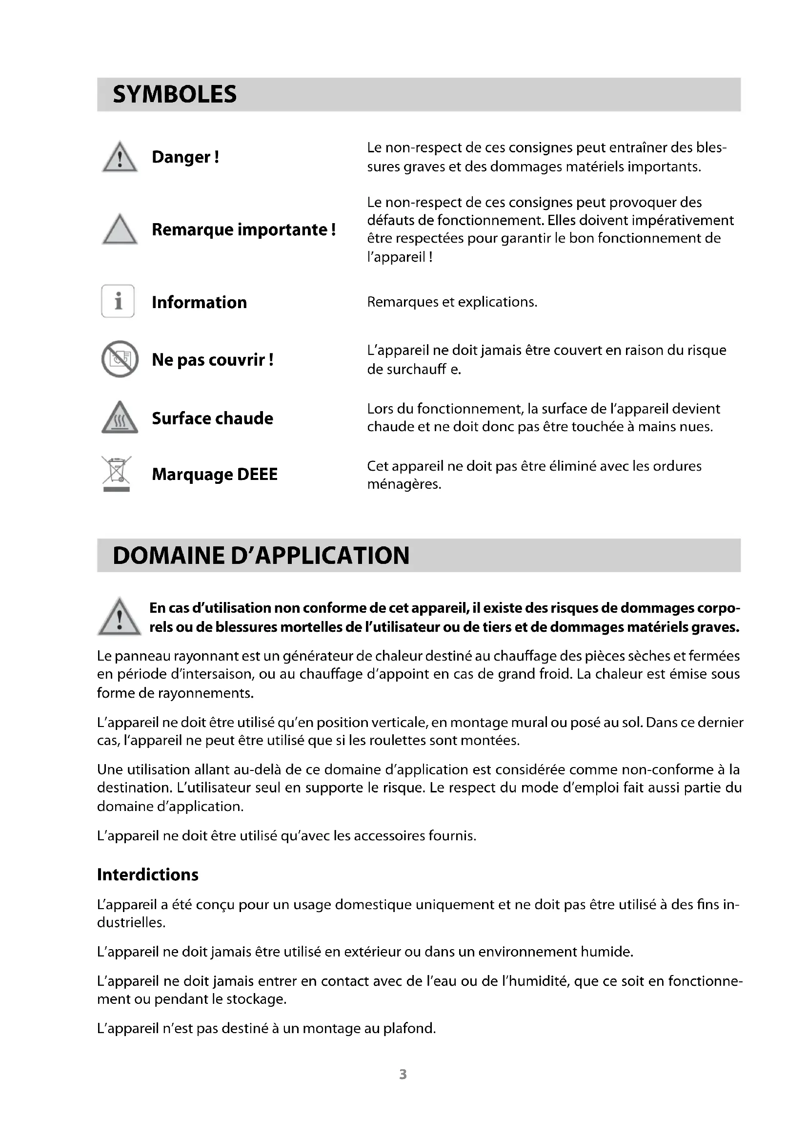 En cas d’utilisation non conforme de cet appareil, il existe des risques de dommages corpo- rels ou de blessures mortelles de l’utilisateur ou de tiers et de dommages matériels graves. Le panneau rayonnant est un générateur de chaleur destiné au chau age des pièces sèches et fermées en période d’intersaison, ou au chau age d’appoint en cas de grand froid. La chaleur est émise sous forme de rayonnements. L’appareil ne doit être utilisé qu’en position verticale, en montage mural ou posé au sol. Dans ce dernier cas, l’appareil ne peut être utilisé que si les roulettes sont montées. Une utilisation allant au-delà de ce domaine d’application est considérée comme non-conforme à la destination. L’utilisateur seul en supporte le risque. Le respect du mode d’emploi fait aussi partie du domaine d’application. L’appareil ne doit être utilisé qu’avec les accessoires fournis. Interdictions L’appareil a été conçu pour un usage domestique uniquement et ne doit pas être utilisé à des ns in- dustrielles. L’appareil ne doit jamais être utilisé en extérieur ou dans un environnement humide. L’appareil ne doit jamais entrer en contact avec de l’eau ou de l’humidité, que ce soit en fonctionne- ment ou pendant le stockage. L’appareil n’est pas destiné à un montage au plafond.4