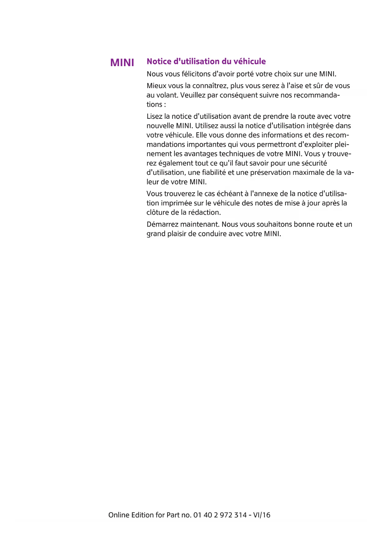Lisez la notice d'utilisation avant de prendre la route avec votre nouvelle MINI. Utilisez aussi la notice d'utilisation intégrée dans votre véhicule. Elle vous donne des informations et des recommandations importantes qui vous permettront d'exploiter pleinement les avantages techniques de votre MINI. Vous y trouverez également tout ce qu'il faut savoir pour une sécurité d'utilisation, une fiabilité et une préparation maximales de la valeur de votre MINI.