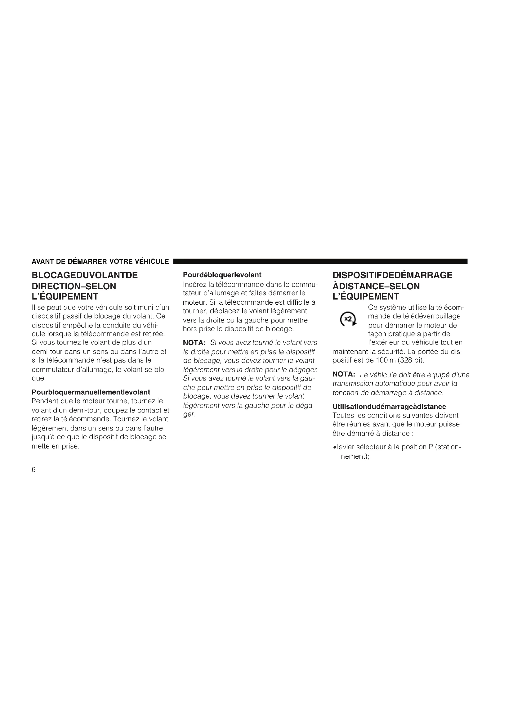 BLOCAGEDUVOLANTDEDIRECTION-SELON L'ÉQUIPEMENT. 6 Pourbloquermanuellementlevolant. 6 Pourdébloquerlevolant. 6 DISPOSITIFDEDEMARRAGEADISTANCE- SELONL'ÉQUIPEMENT. 6
