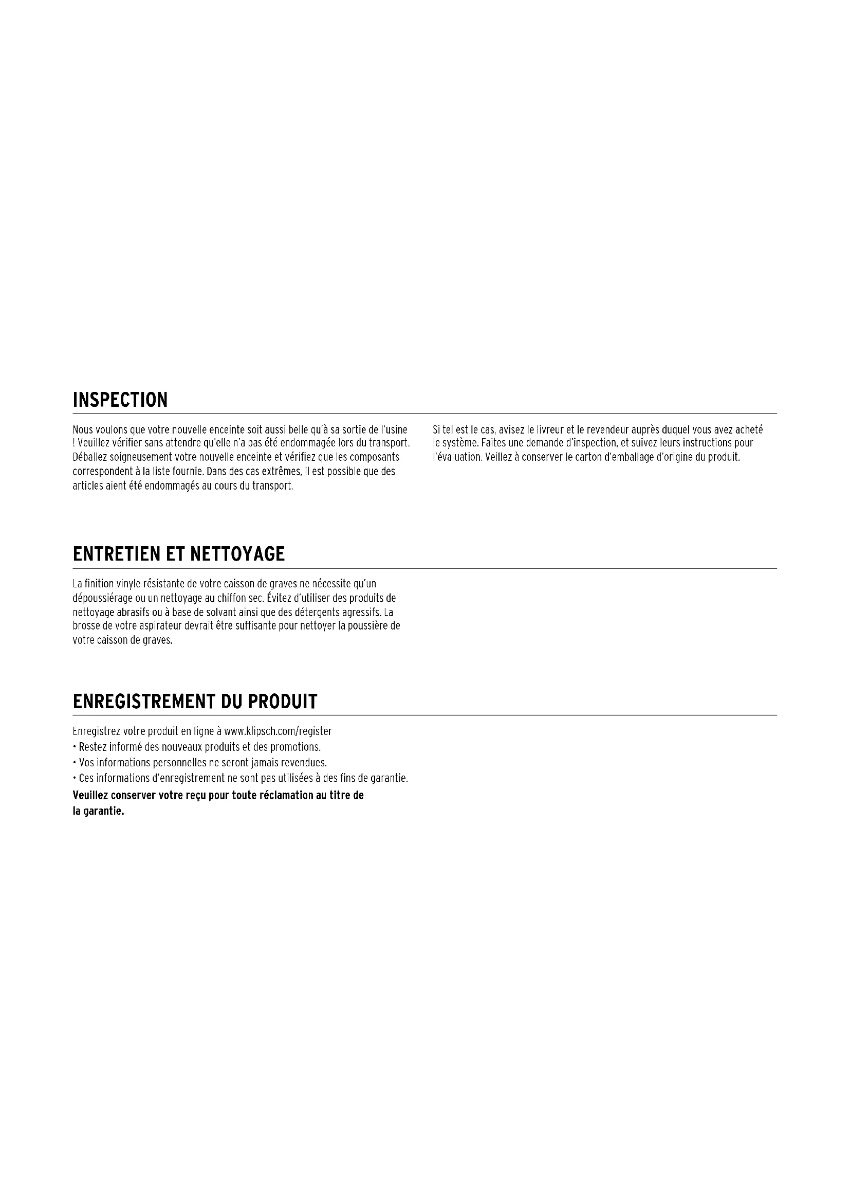 - Ces informations d’enregistrement ne sont pas utilisées à des fins de garantie. Veuillez conserver votre reçu pour toute réclamation au titre de la garantie. ENREGISTREMENT DU PRODUITPOSITIONNEMENT DE VOTRE CAISSON DE GRAVES Les caissons de graves actifs Klipsch