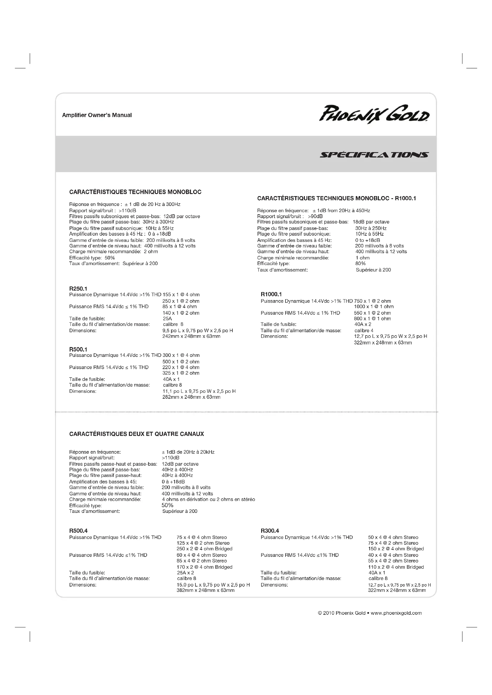 principaleenpositioncentrale(àplat).Mettezàl’arrêttoutesonieou touteautrefonctiondetraitementdusignal. 10.Réglezlacommandeduvolumedel’unitéprincipalepourobtenirune sortiesansdistorsionmaximale(surlaplupartdesunitésprincipales, celaseraàenviron7/8duvolumemaximum).Utilisezunenregistrement dynamiquetrèsclair. 11.Augmentezlacommandedeniveaujusqu’à cequeleshaut-parleursatteignentunesortie maximalesansdistorsion. 12.Répétezlesréglagesdelaniveaupourtousles autresamplicateurs. Remarque:Laniveaudel’amplicateurPhoenixGold,l’amplication desbassesetlescommandesdeniveauLPL44n’ontaucuneffet surlessortiesauxiliaires.Unamplicateurreliéauxsortiesauxiliaires reçoitlemêmeniveaudesignalqueceluidisponiblesurlesentréesde l’amplicateurPhoenixGold(gainunitaire). 13.Réduisezlevolumedel’unitéprincipaleàunniveauconfortable. 14.Écoutezlesdifférentessélectionsmusicalespourvérierlabalance globaledusystème.Comparezl’avantàl’arrière,lesbassesmoyennes àlaplagemoyenne,etc.Siunjeudehaut-parleursestréglésurun volumetropélevéparrapportàunautre,sonniveaudoitalorsêtre abaissépourqu’ilsefondecorrectementaveclesautreshaut-parleurs. L’idéedebaseconsisteàréférencertousleshaut-parleurssurleréglage dujeuleplusfaible. Remarque:Pourlescaissonsd’extrêmesgravescontrôlésparune commandedeniveauPhoenixGoldLPL44,conservezleréglagedela niveau11ou12.UtilisezlaLPL44pourfondrelescaissonsd’extrêmes- gravesdanslerestedusystème.Levolumecorrectducaisson d’extrêmes-graveschangeraenfonctiondesbruitsdelarouteetdes différencesd’enregistrement. 15.Réglezlesfréquencesdultrepassifpouratteindrelameilleure adéquationpossiblepourchaqueensembledehaut-parleurs. 16.Ajustezlescommandesd’égalisationdesbassessurl’amplicateur, l’unitéprincipaleouleprocesseurenavalsinécessairepouraugmenter lasortie. Remarque:Utilisezcescommandesavecmodération.Chaque amplicationde3dBnécessiteledoubledelapuissanceà45Hz. Sivotresystèmedecaissond’extrêmesgravesnécessitebeaucoup d’amplicationpourdonnerunbonson,ilyapeut-êtreunproblème. Rechercheztoutsignedehaut-parleurdegravesdéphasé,unefuiteau niveauduboîtierducaissond’extrêmesgravesouunetailledeboîtier incorrecte. 17.Unefoistouslesniveauxrégléscorrectement,lesystèmeatteindraune sortieglobalemaximalesansdistorsionauvolumerégléàl’étape10. Pas de courant:Vériezlevoltagedel’amplicateuravecunvoltmètre,B+etREM(avecl’unité principaleenmarche)levoltagedoitêtreentre12,2Vet14,6Vlorsqueleconducteurdemasse del’ampliestutilisé.Vériezlefusibledel’amplietdelapile.Utilisezunmètrepourvérierla connexiond’unboutdufusibleàl’autre,lesbrisn’étantpastoujoursvisibles.Silefusibleest grillé,vériezlecordond’alimentationetaussil’amplicateurpouruncourt-circuit.Silecourt- circuitestdansl’amplicateur,voirvotredistributeurPhoenixGold.S’iln’yapasdecourt-circuit, remplacezlefusible. Du courant mais pas de son:Allumezl’amplicateuretvérieztouslescâblesdesignaux d’entréeetdesortieettouteslesconnexionsélectriques.Vériezleshaut-parleursavecun voltmètrepouruncourt-circuitouenlesconnectantàuneautresourceaudio.Aprèsvousêtre assuréquetoutestcorrect,allumezdenouveaul’amplicateur. Puissance sans le son et le VOYANT DEL PROTECT allumé:LevoyantrougePROTECT s’allumelorsquel’amplicateurs’arrêtepourlaprotectionthermiqueoucontrelessurtensions. Une haute température de fonctionnement interne de l’amplicateur va déclencher l’arrêt thermique : aprèsunrefroidissementd’environ5°C,l’amplicateurredémarre.Uncourt- circuitduhaut-parleuroulefonctionnementavecuneimpédanceexceptionnellementfaible déclencherontl’arrêt:redémarrerleterminalREMdel’amplicateurpourrestaurerl’opération. Vérierlescourt-circuitsoulesdommagesdeshaut-parleursoudessystèmesderépartiteurssi desarrêtsseproduisent. Pas de son d’un côté:Vériezlecontrôledebalancedansl’unitéprincipale.Vériezles connexionsduhaut-parleurVériezlaconnexiondusignald’entrée. Très faible débit: Vériezlecontrôledugradateurdel’unitéprincipaleouleniveaudesensibilité d’entréedel’amplicateur. Arrêts fréquents de l’amplicateur avec récupération automatique: Celaindiquel’arrêt thermiquechroniquedel’amplicateurenraisondufonctionnementàhautetempérature intérieureconstante.Unehautetempératuredefonctionnementpeutêtreprovoquéeparune insufsancedelaventilation:voirlasectionPOSITION/MONTAGEdecemanuelpourdes conseilssurl’emplacementdel’amplicateur.Unehautetempératuredefonctionnementrésulte égalementdufonctionnementdel’amplicateursousuneimpédanceanormalementbasseau niveaudela charge des haut-parleurs: PhoenixGoldrecommandedesimpédancesdechargeminimale de2ohmsstéréoou4ohmspont.Vériezaussileshaut-parleursquipeuventêtreendommagés oulessystèmespassifsderépartiteurs.Enn,l’arrêtthermiquechroniquepeutrésulteraussidu fonctionnementnormaldel’amplicateuràunehautepuissancedesortie,cequipeutêtrerésolu enassurantunrefroidissementsupplémentairedel’amplicateur,l’installationd’unamplicateur depuissancesupérieureouenréduisantleniveaudesortiedel’amplicateur. “Motor Boating” – l’indicateur de courant s’éteint de façon répétée lorsque le système audio est allumé:Vériezlaconnexiondel’ampliàlapile.Vériezlevoltagedelapile.Sile voltageestbas,rechargezlapileouremplacez-la.Vérieztouteslesconnexionsdemasse. Système de réglage Dépannage© 2010 Phoenix Gold • www.phoenixgold.com Amplier Owner’s Manual Système de diagrammes