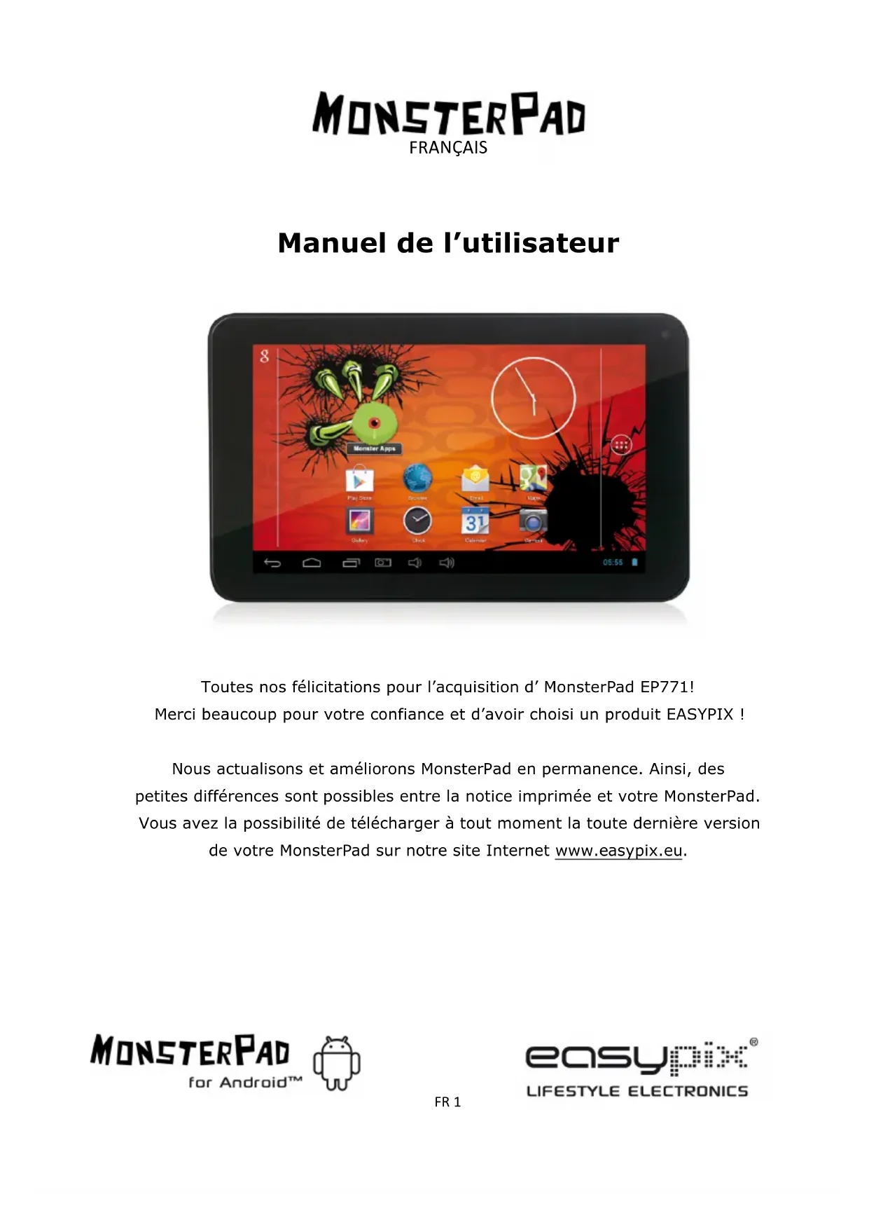 Toutes nos félicitations pour l’acquisition d’ MonsterPad EP771! Merci beaucoup pour votre confiance et d’avoir choisi un produit EASYPIX ! Nous actualisons et améliorons MonsterPad en permanence. Ainsi, des petites différences sont possibles entre la notice imprimée et votre MonsterPad. Vous avez la possibilité de télécharger à tout moment la toute dernière version de votre MonsterPad sur notre site Internet www.easypix.eu.