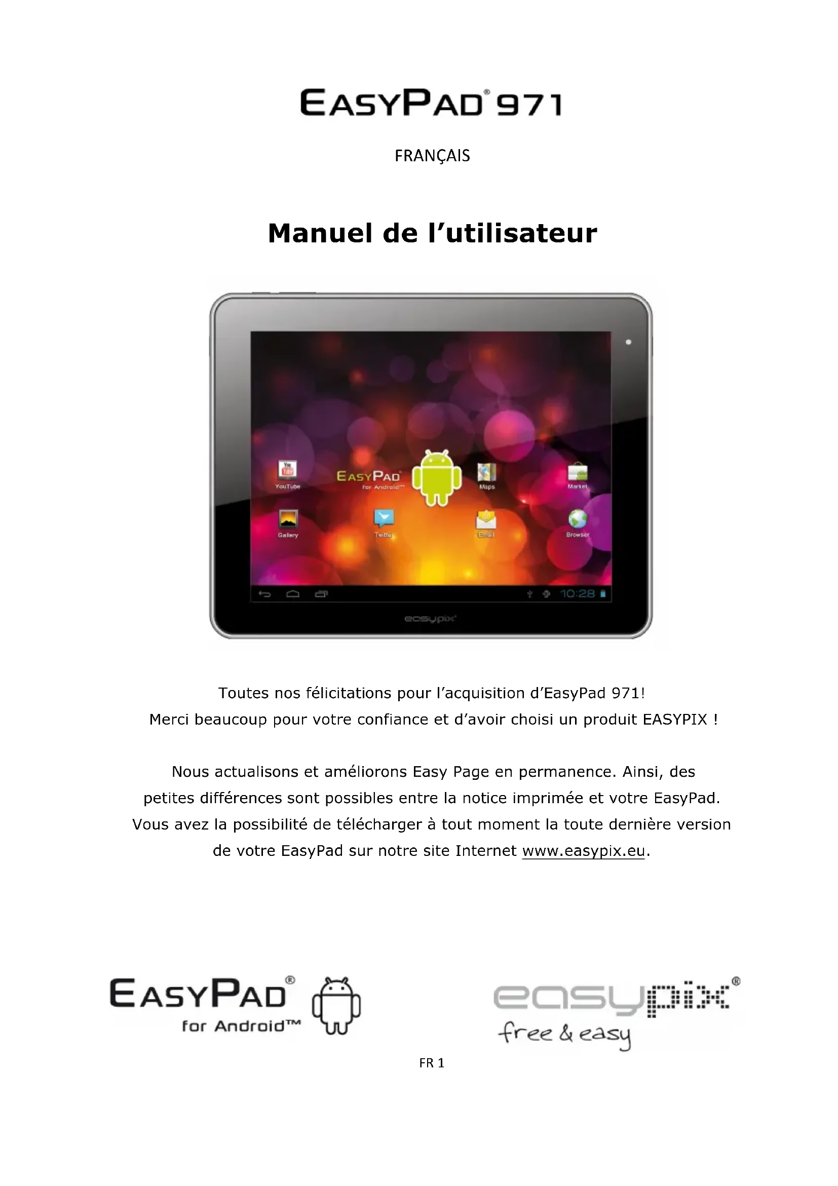 Toutes nos félicitations pour l’acquisition d’EasyPad 971! Merci beaucoup pour votre confiance et d’avoir choisi un produit EASYPIX ! Nous actualisons et améliorons Easy Page en permanence. Ainsi, des petites différences sont possibles entre la notice imprimée et votre EasyPad. Vous avez la possibilité de télécharger à tout moment la toute dernière version de votre EasyPad sur notre site Internet www.easypix.eu.