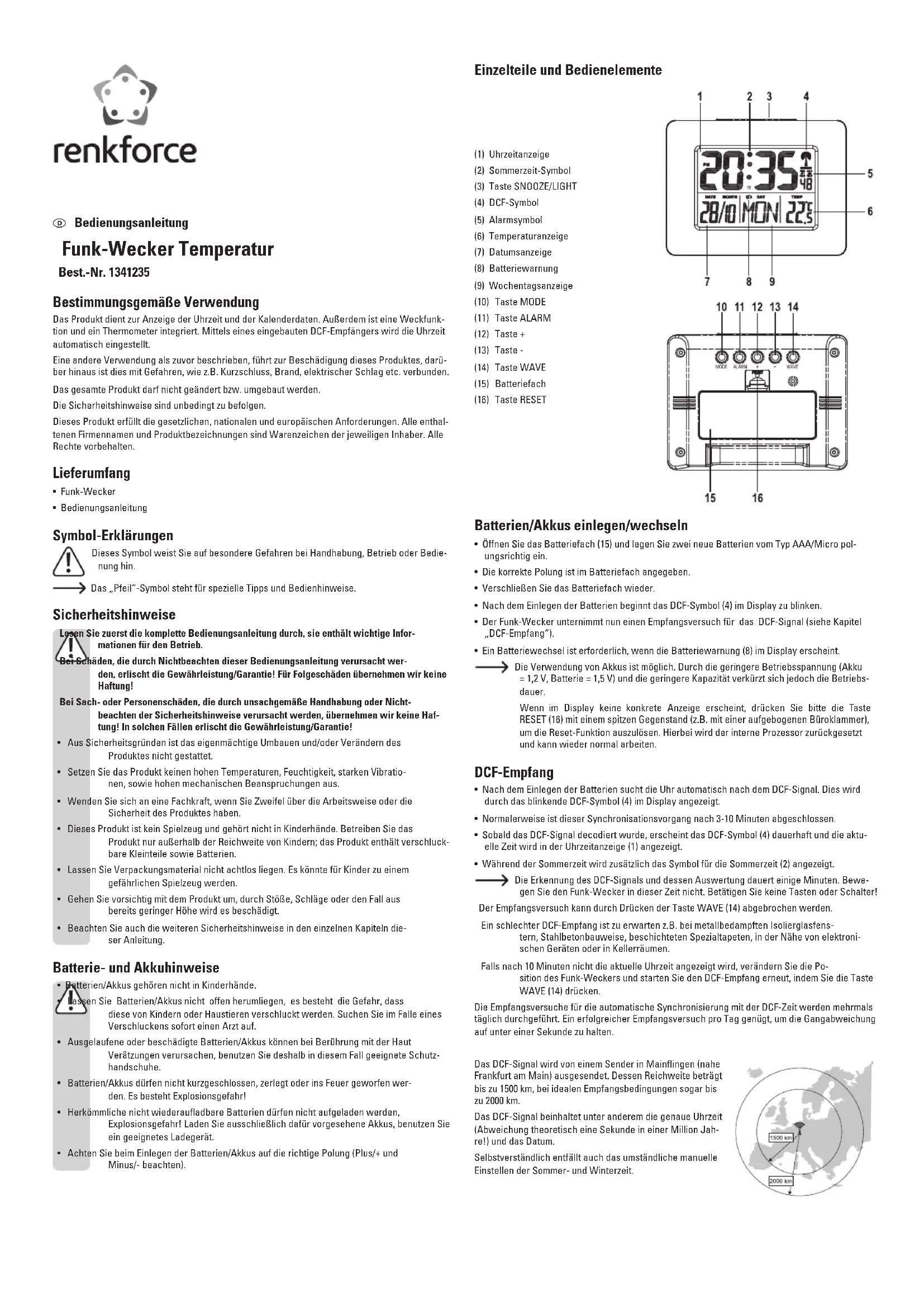 - Appuyez sur la touche RESET (16) avec un objet pointu (p. ex. un trombone déplie). Le microprocesseur intégré est réinitialisé et l'horloge returne en mode de réception du signal DCF.