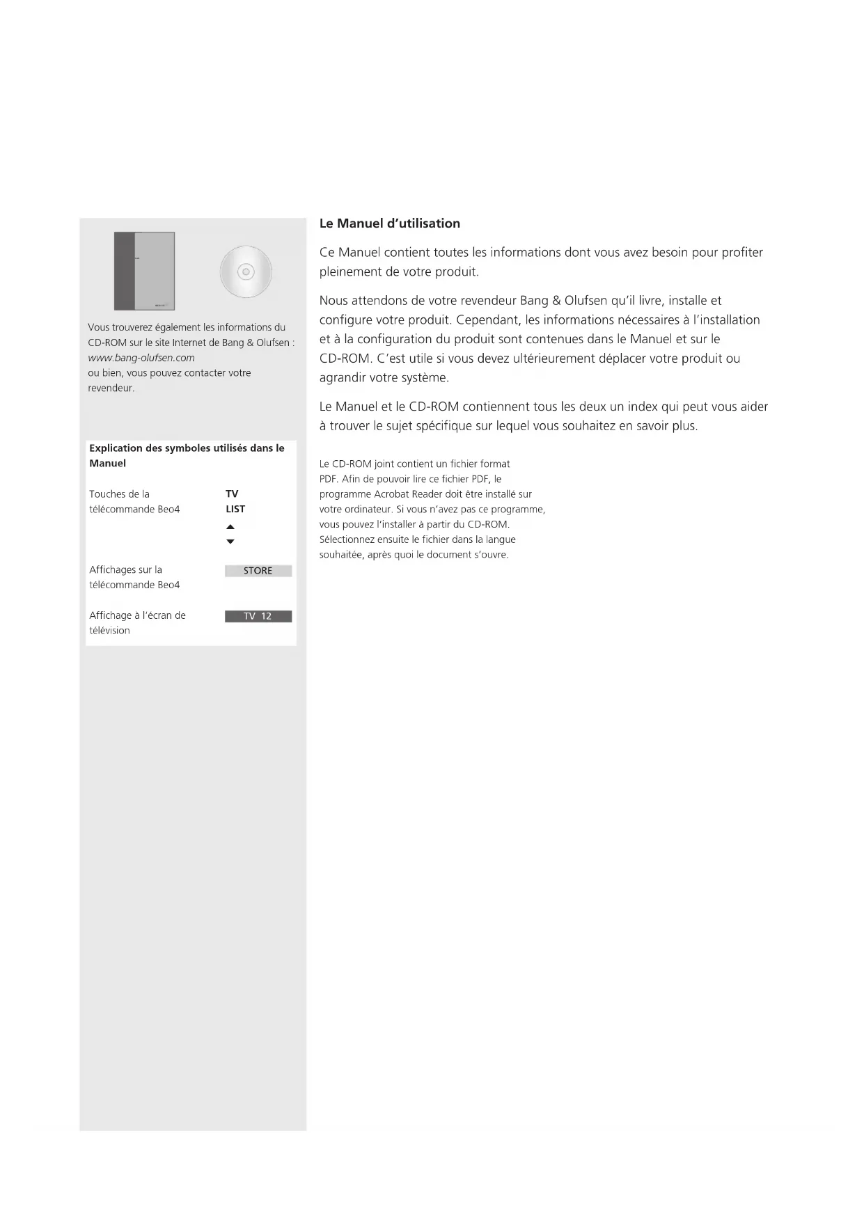 BeoVision 3 – 32 ManuelLe Manuel d’utilisation Ce Manuel contient toutes les informations dont vous avez besoin pour profiter pleinement de votre produit. Nous attendons de votre revendeur Bang & Olufsen qu’il livre, installe et configure votre produit. Cependant, les informations nécessaires à l’installation et à la configuration du produit sont contenues dans le Manuel et sur le CD-ROM. C’est utile si vous devez ultérieurement déplacer votre produit ou agrandir votre système. Le Manuel et le CD-ROM contiennent tous les deux un index qui peut vous aider à trouver le sujet spécifique sur lequel vous souhaitez en savoir plus. Le CD-ROM joint contient un fichier format PDF. Afin de pouvoir lire ce fichier PDF, le programme Acrobat Reader doit être installé sur votre ordinateur. Si vous n’avez pas ce programme, vous pouvez l’installer à partir du CD-ROM. Sélectionnez ensuite le fichier dans la langue souhaitée, après quoi le document s’ouvre. Guide BeoVision Avant Vous trouverez également les informations du CD-ROM sur le site Internet de Bang & Olufsen : www.bang-olufsen.com ou bien, vous pouvez contacter votre revendeur. Explication des symboles utilisés dans le Manuel Touches de la télécommande Beo4 Affichages sur la télécommande Beo4 Affichage à l’écran de télévision