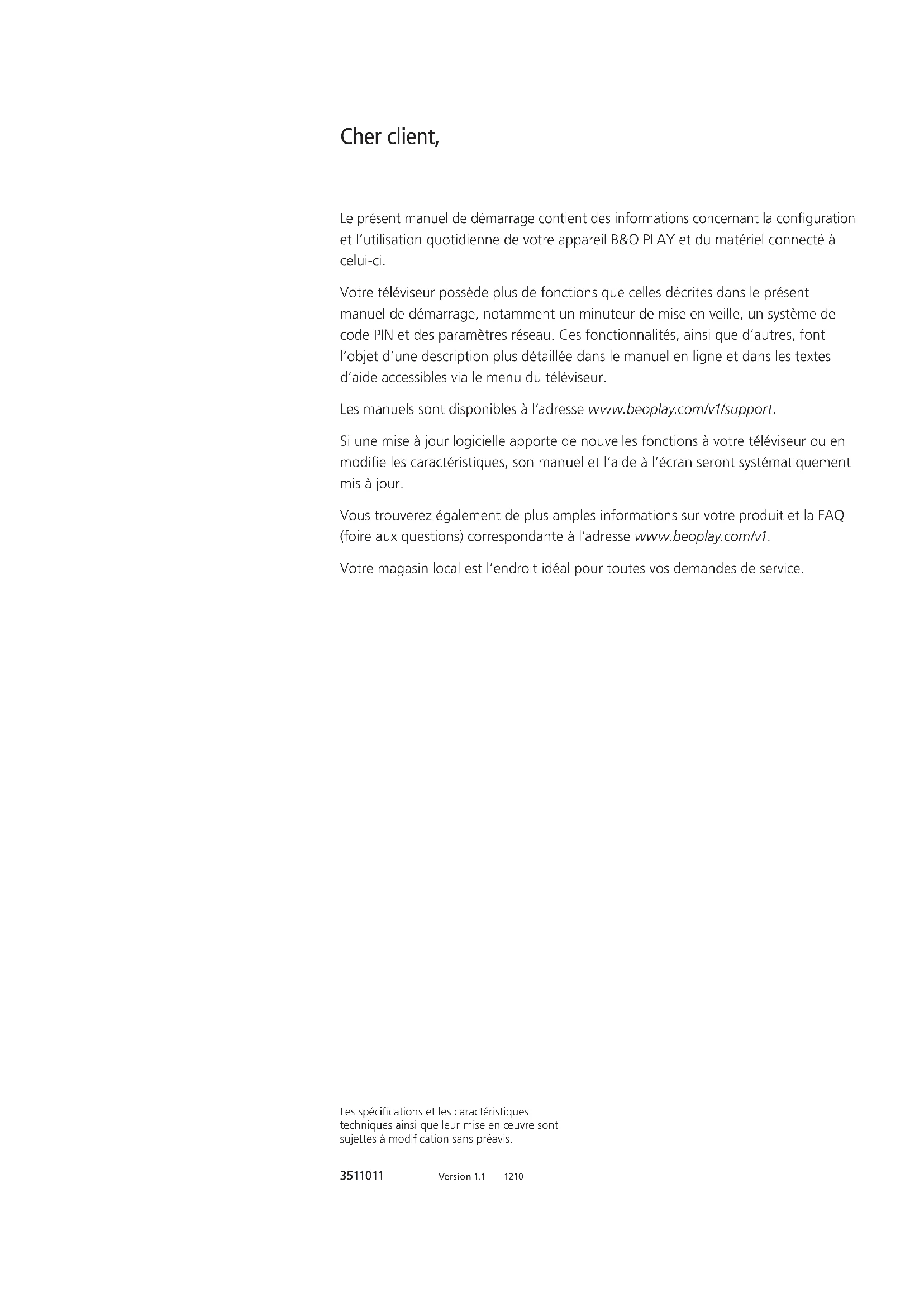 BEOPLAY V1 BeoPlayV1–32 BeoPlayV1–40Le présent manuel de démarrage contient des informations concernant la conguration et l’utilisation quotidienne de votre appareil B&O PLAY et du matériel connecté à celui-ci. Votre téléviseur possède plus de fonctions que celles décrites dans le présent manuel de démarrage, notamment un minuteur de mise en veille, un système de code PIN et des paramètres réseau. Ces fonctionnalités, ainsi que d’autres, font l’objet d’une description plus détaillée dans le manuel en ligne et dans les textes d’aide accessibles via le menu du téléviseur. Les manuels sont disponibles à l’adresse www.beoplay.com/v1/support. Si une mise à jour logicielle apporte de nouvelles fonctions à votre téléviseur ou en modie les caractéristiques, son manuel et l’aide à l’écran seront systématiquement mis à jour. Vous trouverez également de plus amples informations sur votre produit et la FAQ (foire aux questions) correspondante à l’adresse www.beoplay.com/v1. Votre magasin local est l’endroit idéal pour toutes vos demandes de service. Cher client, Les spécications et les caractéristiques techniques ainsi que leur mise en œuvre sont sujettes à modication sans préavis. 3511011 Version 1.1 1210Précautions d’emploi – Vériez que le téléviseur est placé, installé et connecté conformément aux instructions fournies dans ce manuel de démarrage. Pour éviter toute blessure, utilisez uniquement un pied ou un support mural agréé Bang& Olufsen. – Placez votre téléviseur sur une surface solide et stable. – Ne posez aucun objet sur votre téléviseur. – N'exposez pas le téléviseur à la pluie, à un taux d’humidité élevé ou à une source de chaleur. – Le téléviseur est uniquement conçu pour être utilisé à l’intérieur, dans un lieu sec. Plage de températures acceptable: 10 à 40°C. – Si le téléviseur a été exposé à des températures inférieures à 5°C, laissez-le revenir à la température ambiante normale avant de le brancher sur le secteur et de l’allumer. – Évitez toute exposition directe du téléviseur aux rayons du soleil ou à une source de lumière articielle (spot, etc.), ceci étant susceptible de réduire la sensibilité de réception de la télécommande. En outre, une éventuelle surchauffe de l’écran peut entraîner l’apparition de points noirs. Ces points noirs disparaissent dès que le téléviseur revient à une température normale. – Laissez sufsamment d’espace autour du téléviseur pour une ventilation appropriée. – Ne placez aucune source de ammes nues (comme des bougies allumées) sur l’appareil. – Pour éviter tout risque d’incendie, tenez toujours le produit à l’écart des bougies et autres ammes nues. – Ne tentez pas d’ouvrir le boîtier de l’appareil. Les opérations de ce type doivent être conées à du personnel de maintenance qualié. – Ne frappez pas la vitre à l’aide d’objets durs ou pointus. – Pour éteindre complètement l’appareil, la seule possibilité est de débrancher la prise murale. La prise murale doit donc toujours être facilement accessible. – Pour une installation et une interconnexion appropriées et sûres de l’équipement dans des systèmes multimédia, respectez les instructions fournies. – L’étiquette du produit se trouve derrière le cache du panneau de connexion.Table des matières Installation 6 Congurer votre téléviseur 8 Panneau de connexion – BeoPlayV1–32 10 Panneau de connexion – BeoPlayV1–40 Utilisation quotidienne 12 Utiliser votre télécommande 13 Utiliser le menu 15 Regarder la télévision 16 Navigateur multimédia 17 Régler les paramètres d’image et de son 18 Nettoyage 19 Comment…Congurer votre téléviseur Important – les manuels et FAQ se trouvent à l’adresse www.beoplay.com/v1/support – Pour retirer le cache du panneau de connexion, soulevez-le par le bas an de le dégager, puis retirez-le. – Branchez la prise secteur, le câble Ethernet et le câble d’antenne ou satellite (selon votre installation). Pour disposer d’une connexion réseau sans l, branchez l’antenne réseau sans l. – Allumez le téléviseur (appuyez sur TV). Si vous êtes invité à saisir un mot de passe, tapez celui qui vous a été fourni par votre revendeur puis procédez à la conguration initiale (voir page suivante). Déballez le téléviseur et posez-le sur une couverture. Retirez les quatre baguettes du téléviseur. Avant le monter le pied ou le support mural, n’oubliez pas d’insérer le cache des enceintes. Tenez-le à deux mains et faites-le coulisser doucement dans l’orice situé sur le côté du téléviseur. Montez ensuite le pied ou le support mural (voir manuel séparé). 3.Connecter votre téléviseur 1.Déballer le téléviseur 2.Insérer le cache des enceintes et monter le pied ou le support mural Vous trouverez les manuels et de plus amples informations (notamment la FAQ) à l’adresse www.beoplay.com/v1/support. Pour extraire le cache des enceintes, poussez-le doucement à l’aide de l’une des quatre baguettes que vous avez retirées du téléviseur. Si le téléviseur est monté sur un support de table ou un support mural, il est d’abord nécessaire de retirer les côtés de ce dernier. Pour de plus amples informations, consultez le manuel fourni avec le pied ou le support mural. Pour garantir une ventilation adéquate, laissez sufsamment d’espace autour de l’écran. N’obstruez pas la grille de ventilation. En cas de surchauffe (voyant de veille qui clignote ou avertissement à l’écran), mettez le téléviseur en veille, sans l’éteindre, pour lui permettre de refroidir. Vous ne pouvez pas utiliser le téléviseur pendant cette période. Pour recevoir les mises à jour logicielles et télécharger les tables PUC, vous devez connecter votre téléviseur à Internet. Nous vous recommandons de régler le téléviseur de manière 