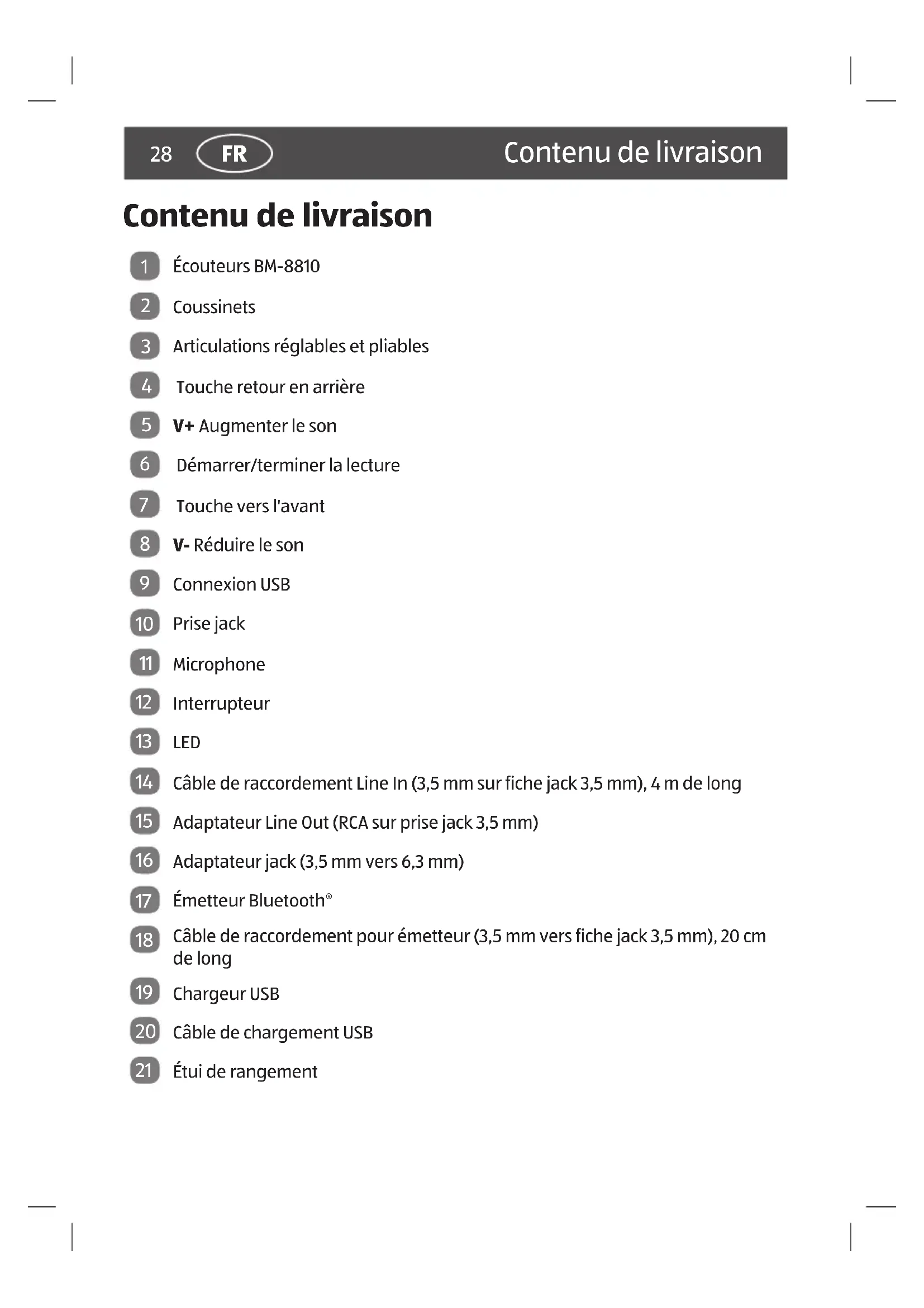 Écouteurs BM-8810 Coussinets Articulations réglables et pliables Touche retour en arrière V+ Augmenter le son Démarrer/terminer la lecture Touche vers l'avant V- Réduire le son Connexion USB Prise jack Microphone Interrupteur