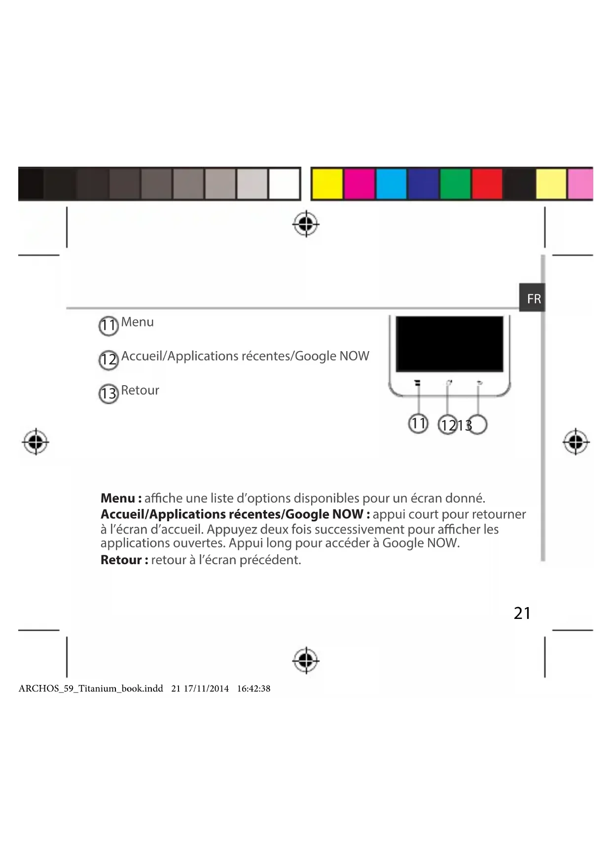 Menu : ache une liste d’options disponibles pour un écran donné. Accueil/Applications récentes/Google NOW : appui court pour retourner à l’écran d’accueil. Appuyez deux fois successivement pour acher les applications ouvertes. Appui long pour accéder à Google NOW. Retour : retour à l’écran précédent. Menu Accueil/Applications récentes/Google NOW Retour ARCHOS_59_Titanium_book.indd 21 17/11/2014 16:42:3822 Assemblage Ouvrir
