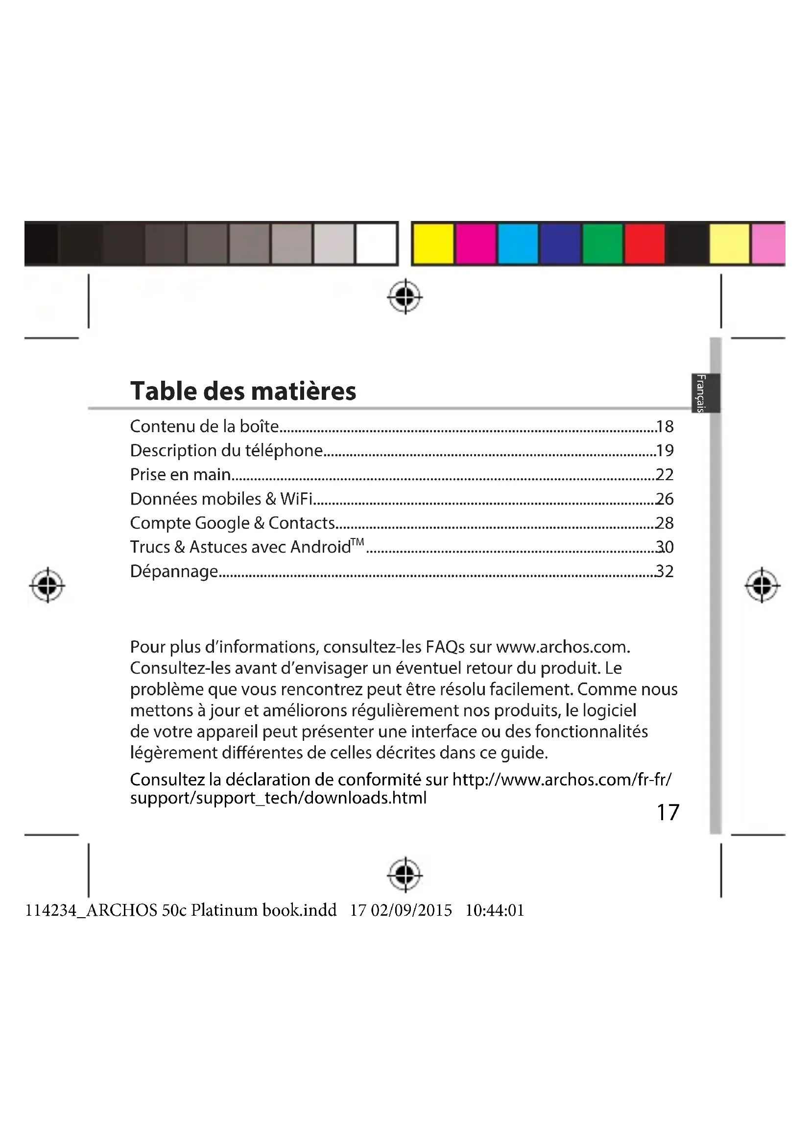 to add new parameters and enter the exact connection parameters provided by your 3G provider. 114234_ARCHOS 50c Platinum book.indd 16 02/09/2015 10:44:0117 Français Pour plus d’informations, consultez-les FAQs sur www.archos.com. Consultez-les avant d’envisager un éventuel retour du produit. Le problème que vous rencontrez peut être résolu facilement. Comme nous mettons à jour et améliorons régulièrement nos produits, le logiciel de votre appareil peut présenter une interface ou des fonctionnalités légèrement diérentes de celles décrites dans ce guide. Contenu de la boîte..................................................................................................... Description du téléphone......................................................................................... Prise en main.................................................................................................................. Données mobiles & WiFi............................................................................................. Compte Google & Contacts...................................................................................... Trucs & Astuces avec Android