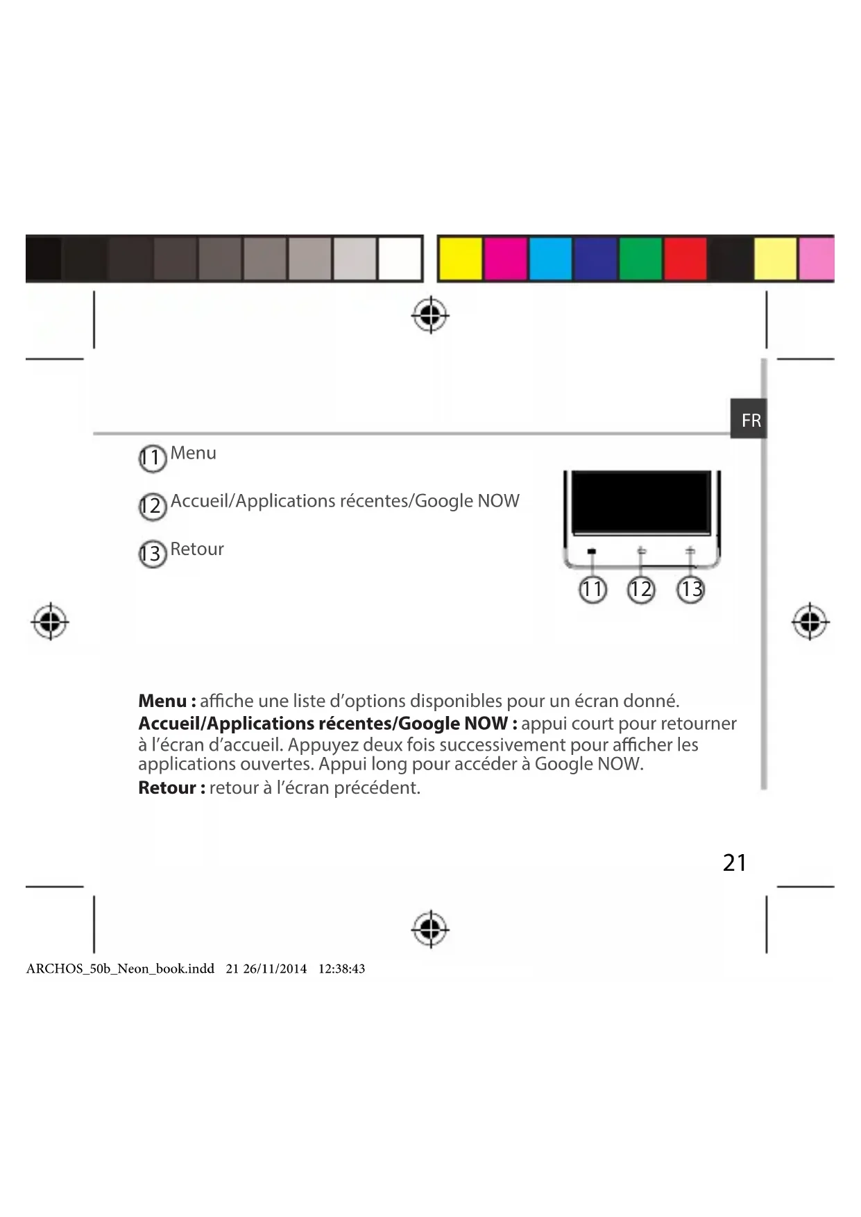 Emplacement1 carte SIM 2G/3G Emplacement2 carte SIM 2G Emplacement3 carte mémoire Utilisez l’encoche pour enlever la coque arrière ARCHOS_50b_Neon_book.indd 23 26/11/2014 12:38:4324 Allumer