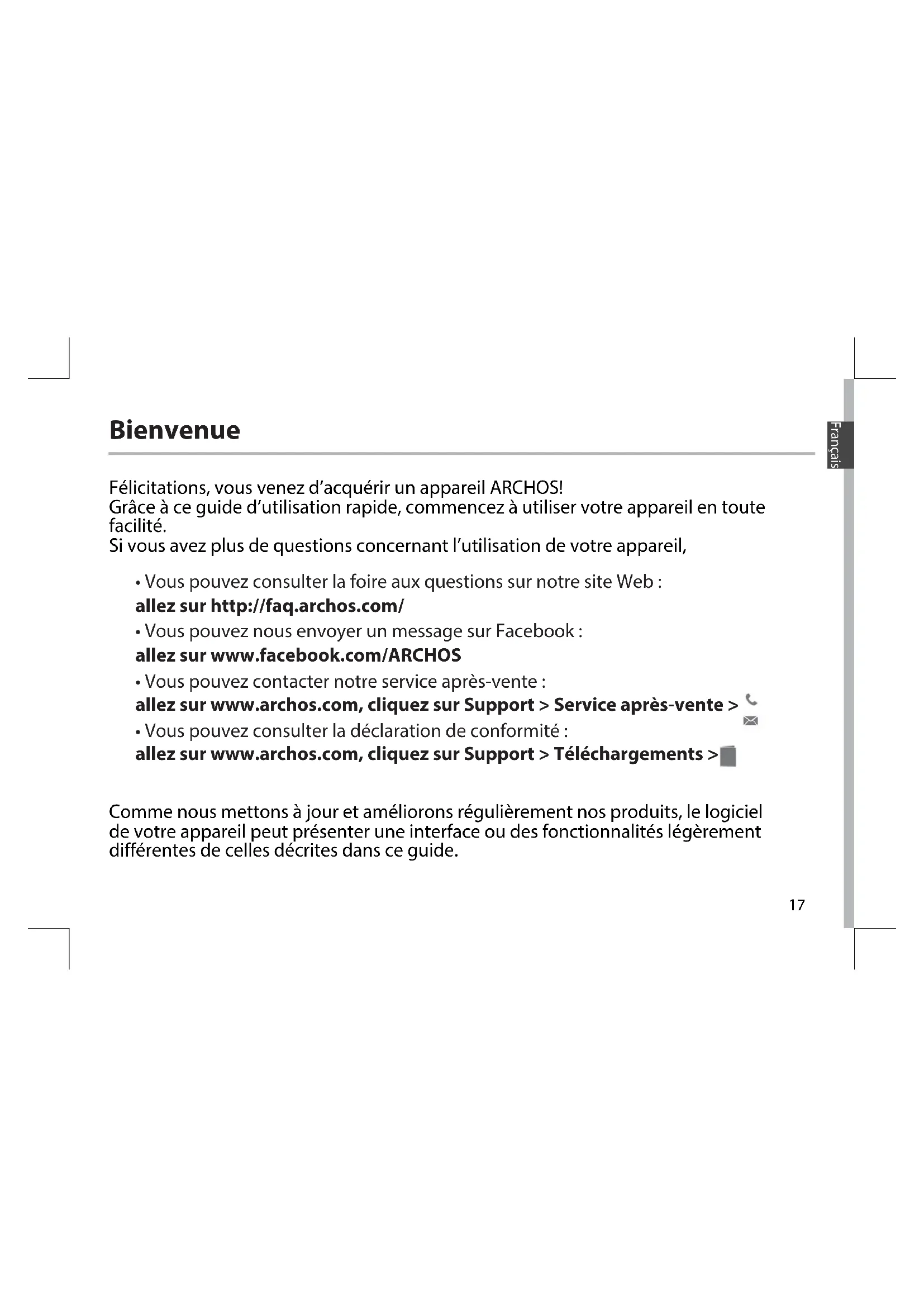 add new parameters and enter the exact connection parameters provided by your 3G provider.17 Français Félicitations, vous venez d’acquérir un appareil ARCHOS! Grâce à ce guide d’utilisation rapide, commencez à utiliser votre appareil en toute facilité. Si vous avez plus de questions concernant l’utilisation de votre appareil,