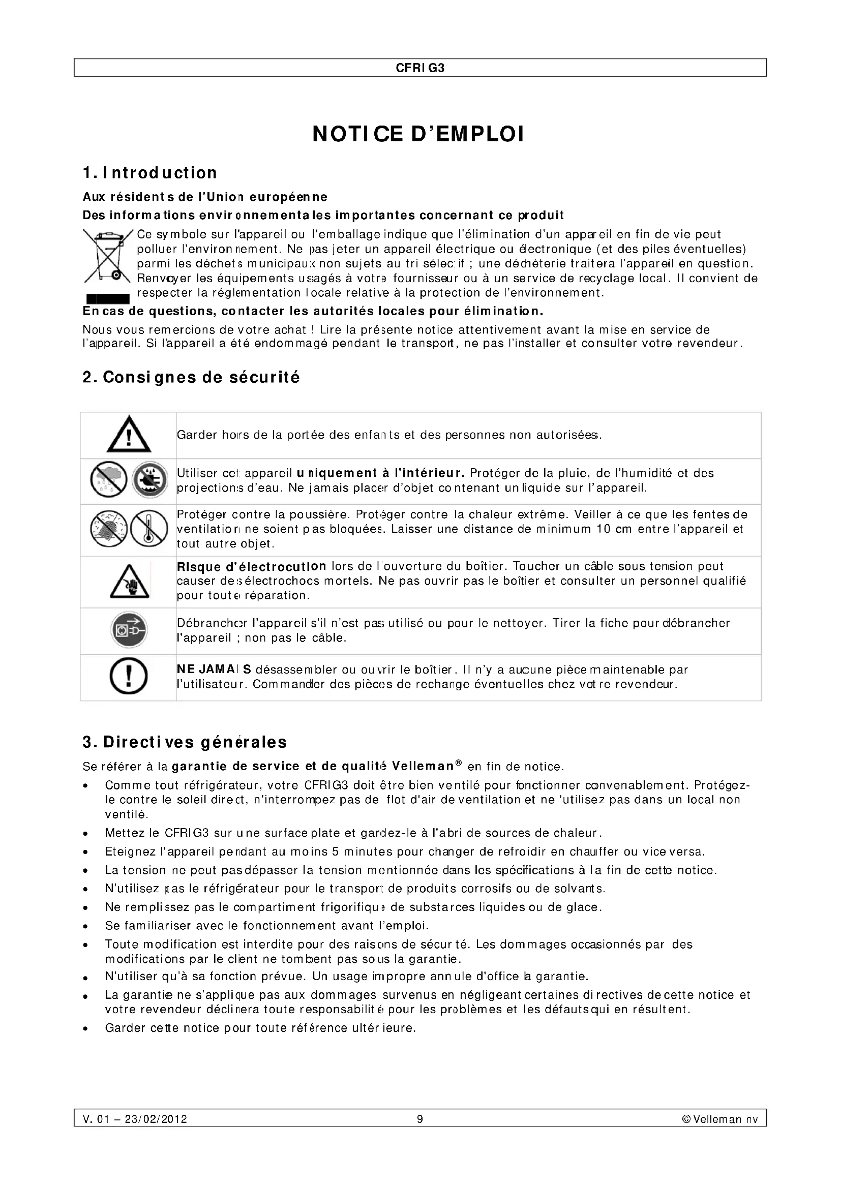 - Comme tout réfrigérateur,Vote CFRIG3 doit être bien ventilé pour fonctionner convenablement. Protégéz-le contre le soleil direct, n'interrompez pas de flot d'air de ventilation et ne 'utilisez pas dans un local non ventilé.