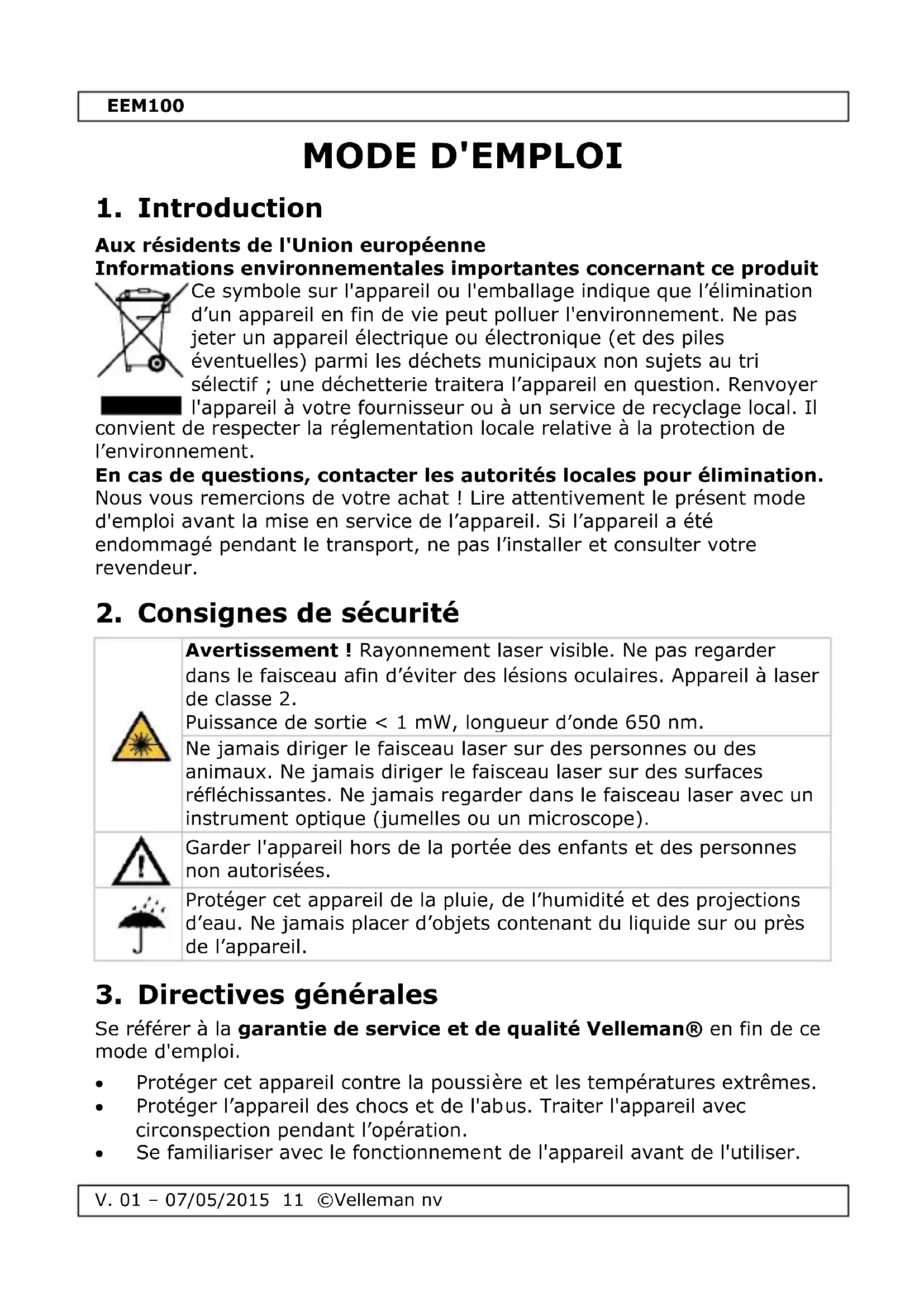 Se référer à la garantie de service et de qualité Velleman® en fin de ce mode d'emploi.