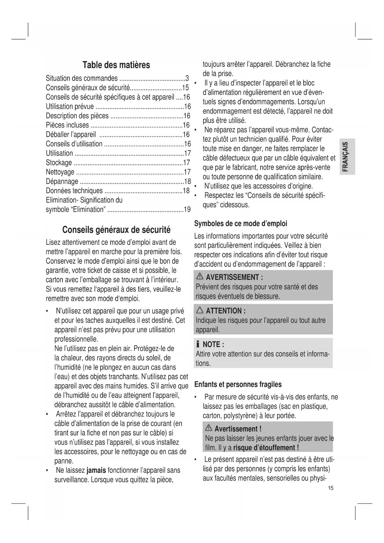 NOTE : Attire votre attention sur des conseils et informa- tions. Enfants et personnes fragiles