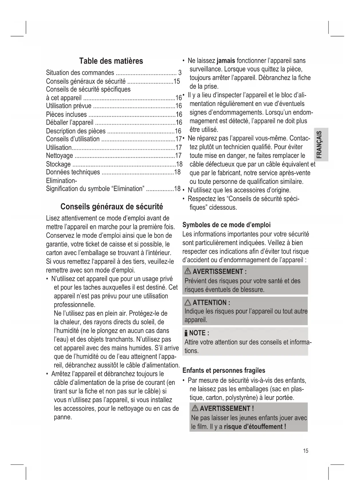 Prévient des risques pour votre santé et des risques éventuels de blessure. ATTENTION : Indique les risques pour l’appareil ou tout autre appareil. NOTE : Attire votre attention sur des conseils et informa- tions. Enfants et personnes fragiles
