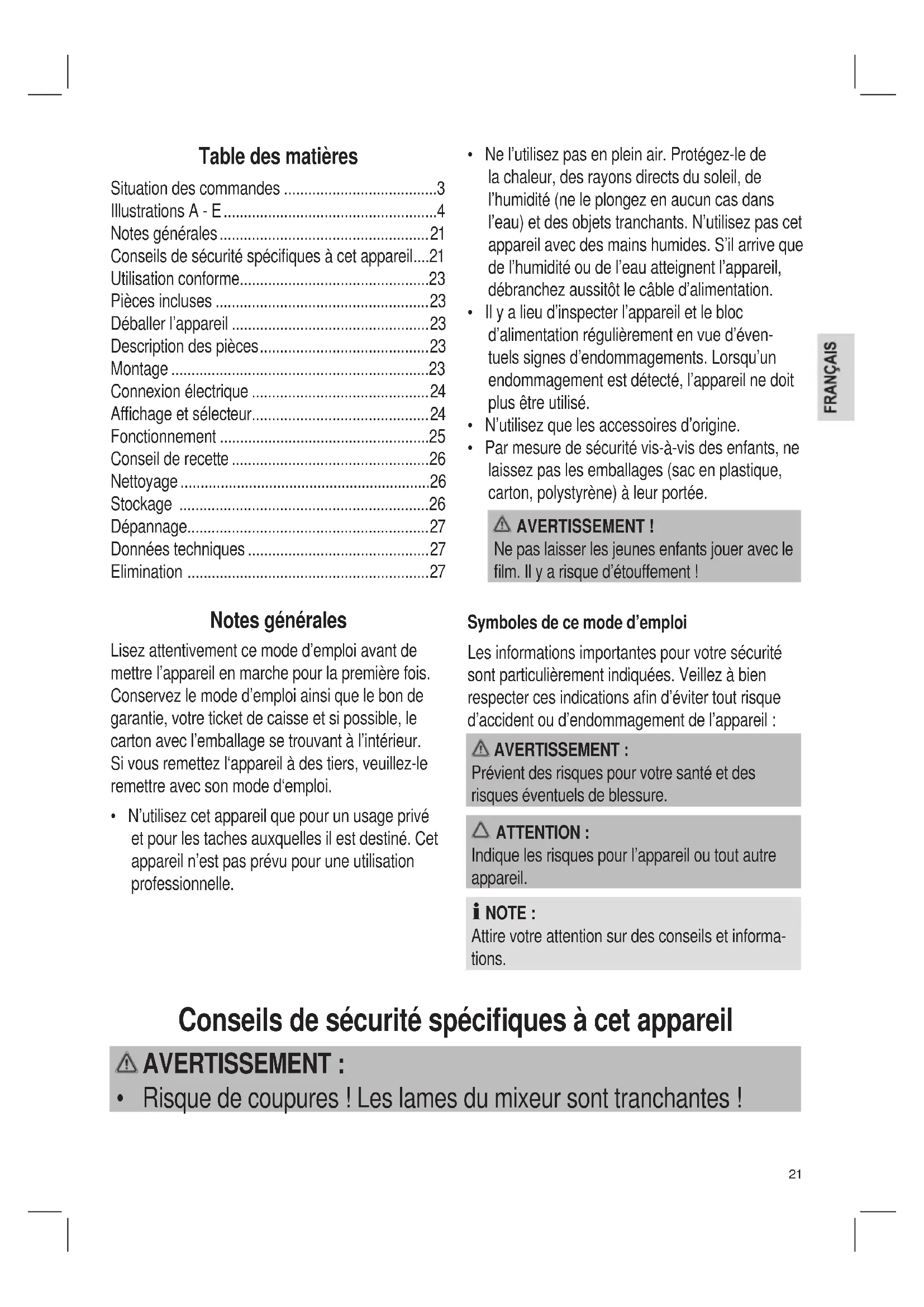 Prévientdesrisquespourvotresantéetdes risqueséventuelsdeblessure. ATTENTION : Indiquelesrisquespourl’appareiloutoutautre appareil. NOTE : Attire votre attention sur des conseils et informa- tions. Conseils de sécurité spécifiques à cet appareil
