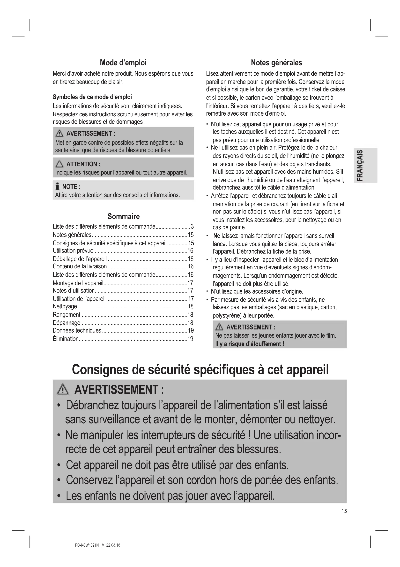 - Les enfants ne doivent pas jouer avec l’appareil.PC-KSW1021N_IM 22.08.18