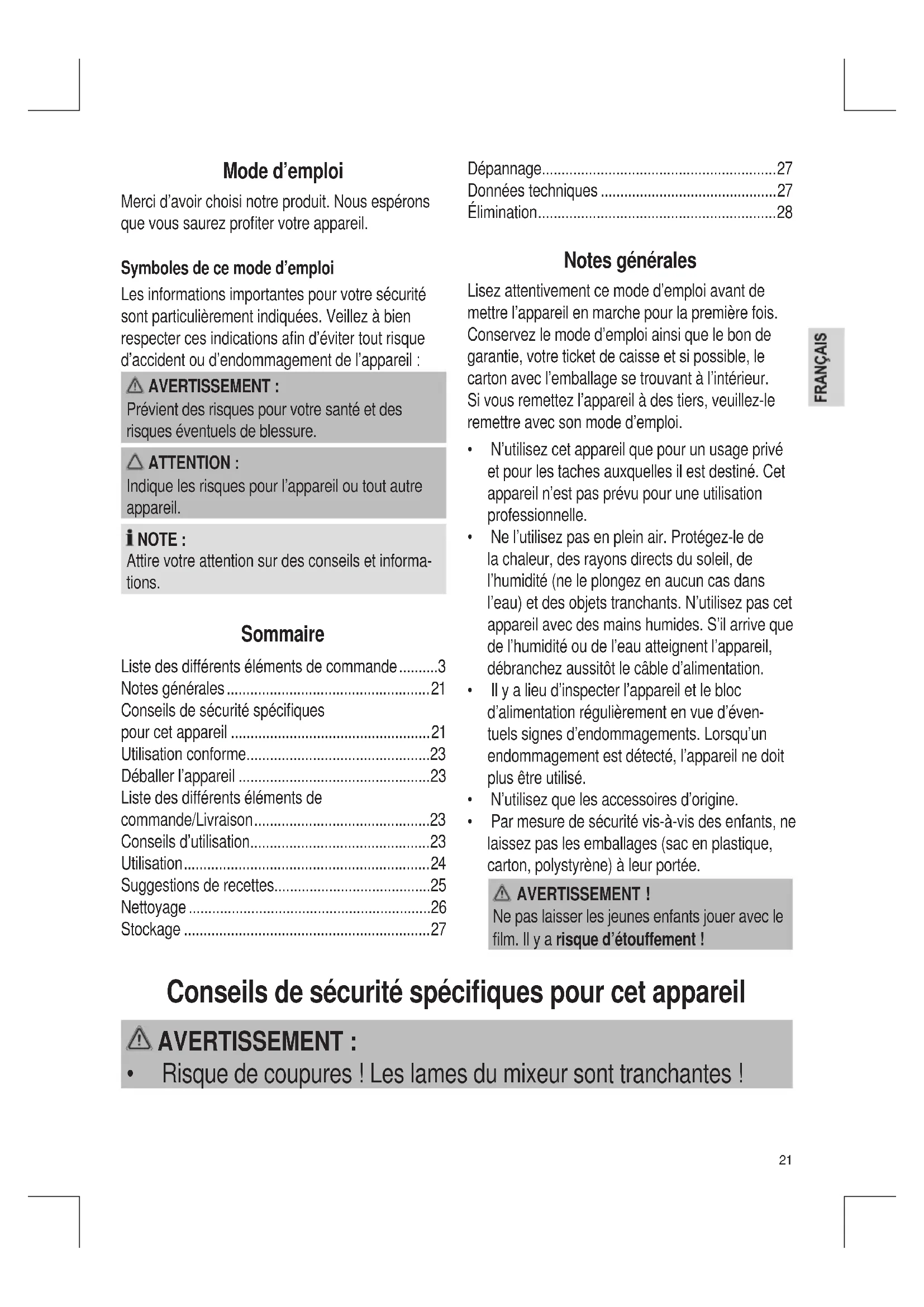 - Conseilsdesécuritéspéciques pour cet appareil p. 21
