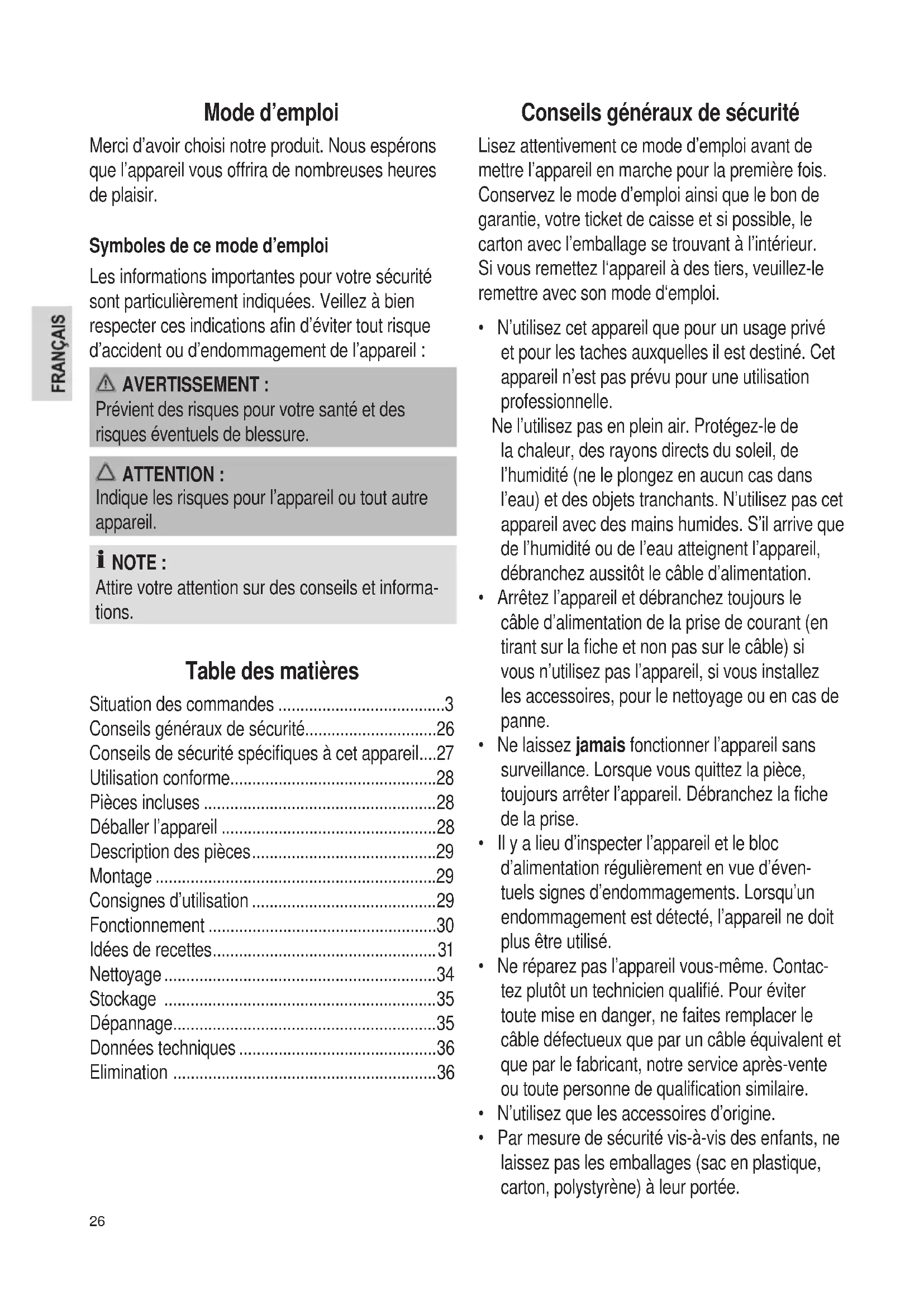 - Fermeztoujourslecouvercleaveclebouchon lorsquevousmélangez. Ingrédients Coupezlesingrédientsenpetitsmorceauxavant delesmettredanslacarafeàmélanger. Fonctionnement ATTENTION :