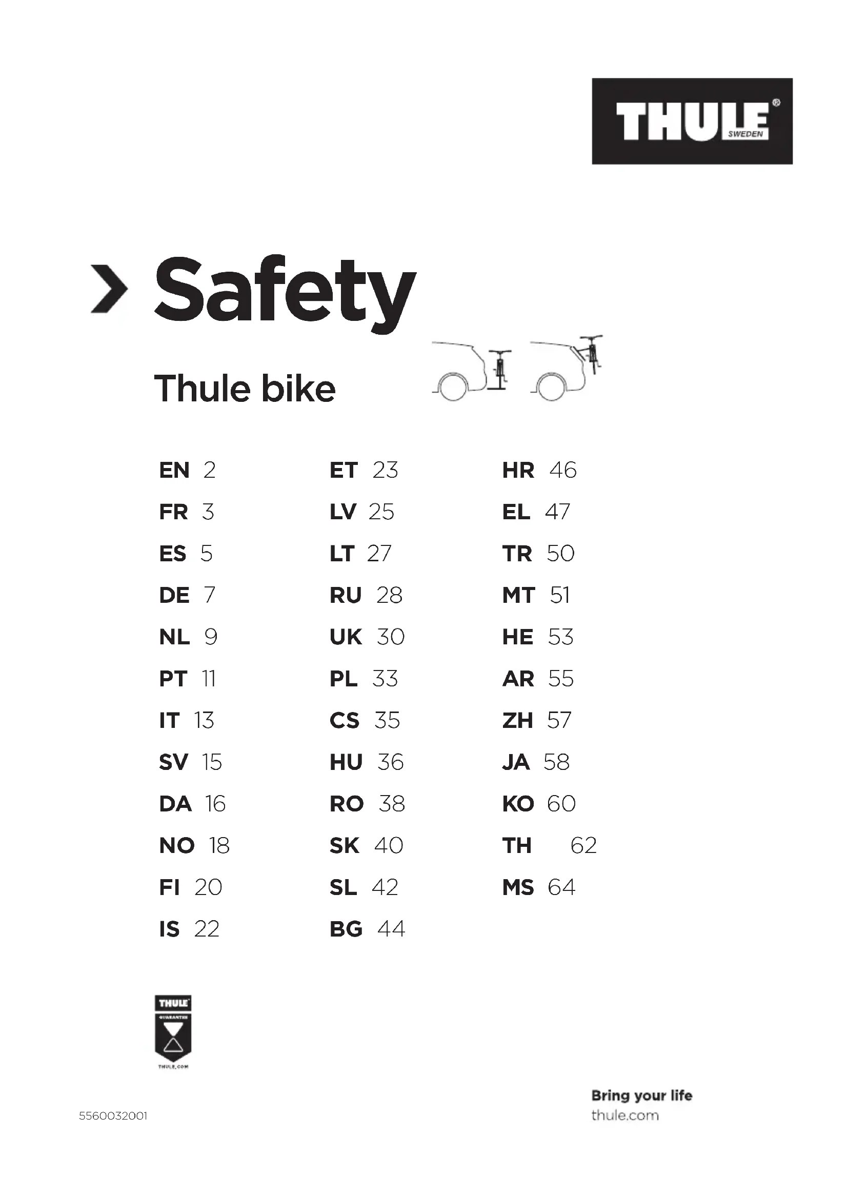 A.0 Informations générales A.1 Thule décline toute responsabilité en cas de dommages corporels, de dommages matériels de biens mobiliers ou immobiliers, de perte de profit, ou de tout autre dommage ou perte résultant du montage ou de l’utilisation inappropriés du porte-vélos, notamment, mais sans s’y limiter, en cas de montage ou d’utilisation ne respectant pas les instructions d’assemblage ou de montage, ou toute autre instruction, écrite ou verbale, formulée par Thule ou un revendeur Thule. A.2 Le porte-vélos et l’ensemble des pièces qui le composent ne doivent en aucun cas être modifiés. A.3 Consultez votre revendeur Thule pour toute question relative au fonctionnement, à l’utilisation ou aux limites du porte-vélos. Veuillez également lire attentivement toutes les instructions et informations de garantie avant de monter et d’utiliser le porte-vélos. B.0 Installation B.1 Reportez-vous aux instructions d’assemblage afin de contrôler la présence de tous les éléments requis. B.2 Lisez et suivez scrupuleusement les instructions d’assemblage et les recommandations fournies, le cas échéant. Procédez au montage de l’unité dans l’ordre indiqué, en commençant par l’étape 1, puis 2, 3, etc. B.3 Ne tentez en aucun cas d’installer le porte-vélos autrement que conformément aux instructions de montage. C.0 Chargement C.1 Le poids de chargement maximal autorisé pour le porte- vélos, tel que spécifié dans les instructions d’assemblage, ne doit en aucun cas être dépassé. Par ailleurs, la charge maximale préconisée pour le véhicule lui-même a toujours priorité sur les spécifications indiquées dans les instructions d’assemblage. C’est toujours le poids maximal recommandé le plus faible qui s’applique, et qui ne doit en aucun cas être dépassé. C.2 Le poids maximal autorisé pour le porte-vélos, tel que spécifié dans les instructions d’assemblage, s’applique aux véhicules en mouvement comme à l’arrêt. C.3 Le chargement doit être correctement fixé. Notez que l’utilisation de tendeurs élastiques est strictement prohibée. C.4 Contrôlez le poids maximal autorisé par vélo indiqué dans les instructions de montage, et veillez à ne pas le dépasser.4 5560032001 C.5 Lors du chargement de vélos sur un porte-vélos sur hayon arrière ou sur boule d’attelage, veillez à toujours placer les vélos les plus lourds et les plus volumineux du côté le plus près de la voiture. C.6 Le porte-vélos a été conçu pour des cadres de vélo standard. Il est strictement interdit de transporter des tandems à l’aide de ce porte-vélos. Contrôlez la taille de cadre de vélo maximale autorisée (diamètre), telle qu’indiquée dans les instructions de montage, et veillez à ne pas la dépasser. C.7 Pour les vélos dotés d’un cadre ou de fourches en carbone, consultez le fabricant ou le revendeur du vélo pour vous assurer de l’utilisation possible du porte-vélos. C.8 Nous recommandons l’utilisation de l’adaptateur pour cadre de vélo Thule 982 pour les porte-vélos arrière, tels que les porte-vélos sur boule d’attelage ou les porte-vélos sur hayon arrière. C.9 Thule décline toute responsabilité quant à l’endommagement de cadres ou de fourches en carbone survenant lors du montage et/ou de l’utilisation du porte-vélos. C.10 Tous les éléments facilement démontables doivent être retirés avant le transport, notamment, mais sans s’y limiter, toute housse pour vélo, tout siège enfant, panier, cadenas (non fixes) ou toute pompe à air. Ces éléments pourraient en eet se détacher au cours du transport en raison de l’augmentation des vibrations et de la résistance à l’air, et constituer un danger pour les autres usagers de la route. C.11 Si le véhicule est équipé d’une fonction d’ouverture automatique du core ou du hayon arrière, celle-ci doit impérativement être désactivée : le compartiment à bagages doit être ouvert manuellement en cas d’utilisation d’un porte-vélos sur hayon arrière, afin de ne pas endommager le véhicule et/ou le porte-vélos. C.12 Si nécessaire, le chargement doit être complété avec les feux et signes d’avertissement appropriés, conformément à la législation locale en vigueur. C.13 Dans la catégorie des véhicules du premier type, approuvés après le 1er octobre 1998, le porte-vélos sur hayon arrière et/ ou le chargement ne doivent en aucun cas couvrir le troisième feu stop, qui doit pouvoir être visible à partir de : - 10 degrés à gauche et à droite de l’axe longitudinal du véhicule ; - 10 degrés au-dessus et 5 degrés en dessous de l’axe horizontal. Si ces mesures ne sont pas respectées, il est impératif d’installer un feu stop de remplacement. L’utilisation du porte-vélos doit en tout temps tenir compte de la législation nationale en vigueur. C.14 Conservez les instructions de montage ainsi que les consignes de sécurité et, le cas échéant, l’attestation de type ECE dans le véhicule équipé du porte-vélos. D.0 Informations importantes relatives aux porte-vélos avec fixation sur boule d’attelage D.1 Les porte-vélos avec fixation sur boule d’attelage ne sont pas adaptés aux barres de remorquage en aluminium ou en GGG40 (fonte). D.2 La boule d’attelage ainsi que la partie cylindrique de la barre de remorquage, qui atteint 2 cm en-dessous de la boule, doivent toutes deux être en acier. Néanmoins, le support de boule d’attelage peut quant à lui être constitué d’aluminium. D.3 Le poids combiné du porte-vélos et du chargement ne doit en aucun cas dépasser la capacité de charge autorisée sur la boule d’attelage. Pour en savoir plus, consultez la plaque signalétique située en regard de la boule d’attelage ou le manuel du véhicule. D.4 Vérifiez toujours que la boule d’attelage est exempte de poussière ou d’huile, et qu’elle est en bon état. Certains fabricants protègent leur