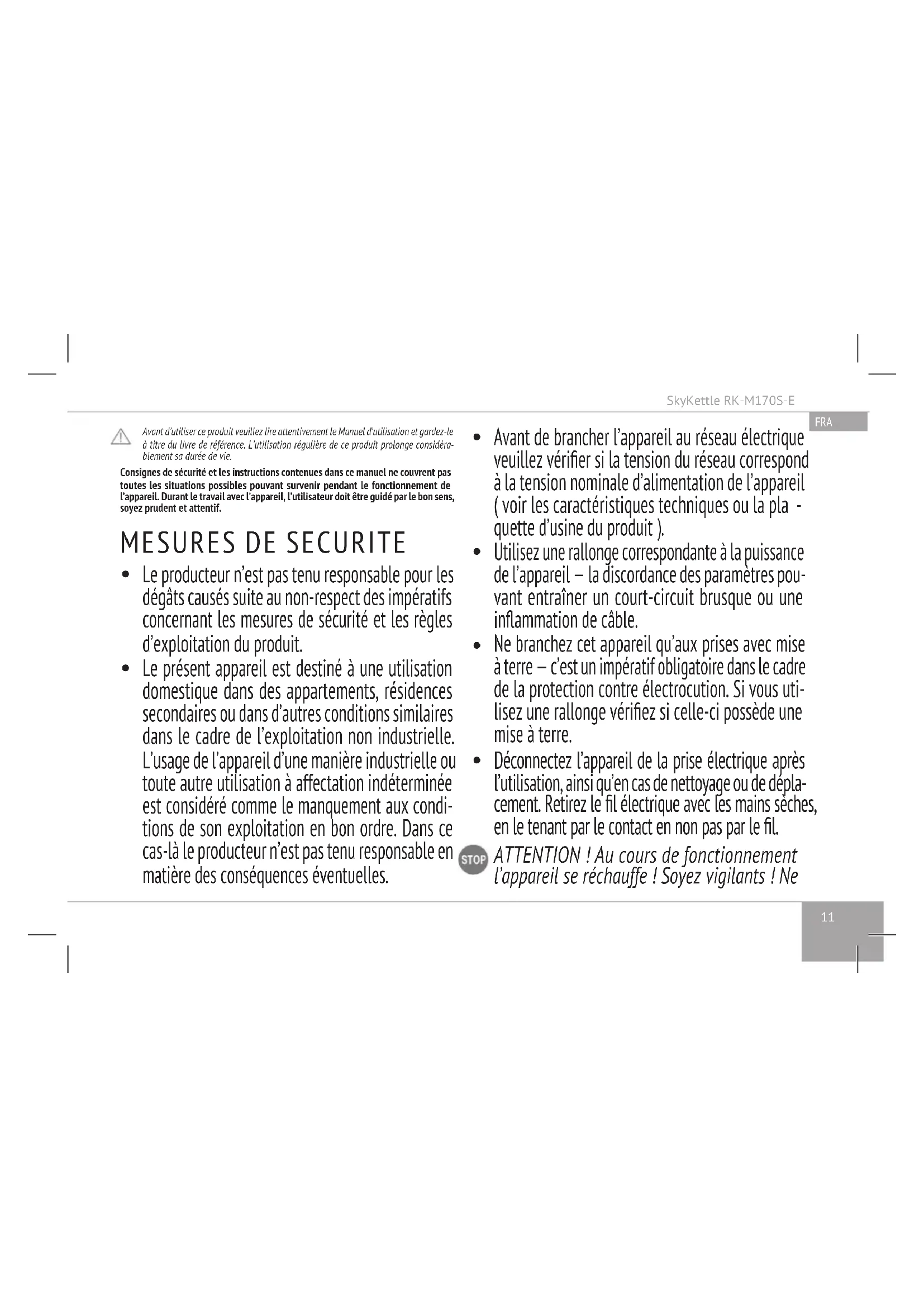 La réparation de l’appareil réalisée par ses propres soins ou des modications quelconques de sa struc- ture sont interdites. Tous les travaux de maintenance sont à exécuter par le Centre de services agrée. Le travail incompétent peut entraîner une panne de l’appareil, des accidents et la détérioration des biens. ATTENTION! Il est défendu d’utiliser cet ap- pareil en cas des détériorations quelconques. Caractéristiques techniques Modèle ........................................................................................................SkyKettle RK-M170S-E Puissance ..................................................................................................................... 2000-2400 W Tension ........................................................................................................... 220-240 V, 50/60 Hz Protection électrique ........................................................................................................... classe I Capacité ........................................................................................................................................ 1,7 L Corps de l’appareil ........................................................acier inoxydable, coque en plastique Filtre ................................................................................................................ anti tartre amovible Choix de la température de chauffe................................................40, 55, 70, 85, 95, 100°C Télécommande avec la Fonction «Ready for Sky» ............................................................ oui Transfert des données par .................................................................................... Bluetooth v4.0 Support des systèmes d’exploitation .....................................................................iOS, Android Fonction ébullition de l’eau ......................................................................................................oui Fonction chauffage de l’eau à la tempétature programmée sans ébullition .............. oui Maintien automatique de la tempétature programmée de l’eau jusqu’à ........ 12 heures Arrêt automatique: