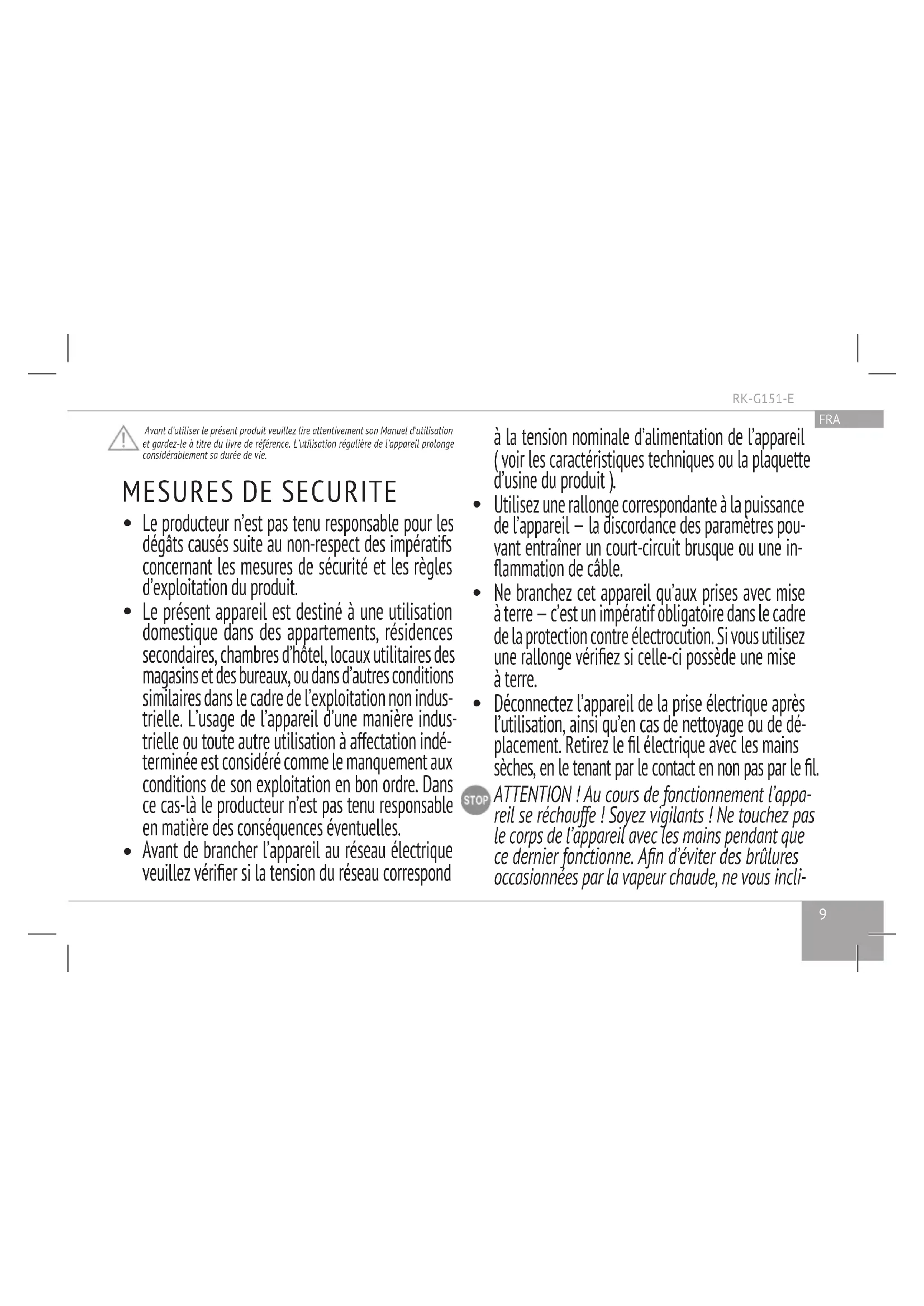 Cet appareil peut être utilisé par des enfants de 8 ans et plus, ainsi que par des personnes dont les capacités physiques ou mentales sont réduites ou des personnes sans expérience ou sans connaissance, uniquement si elles ont pu bénécier d’une surveil- lance ou d’une instruction préalables concernant l’utilisation de l’appareil. Garder l’appareil et son cordon d’alimentation hors de la portée des enfantsRK-G151-E