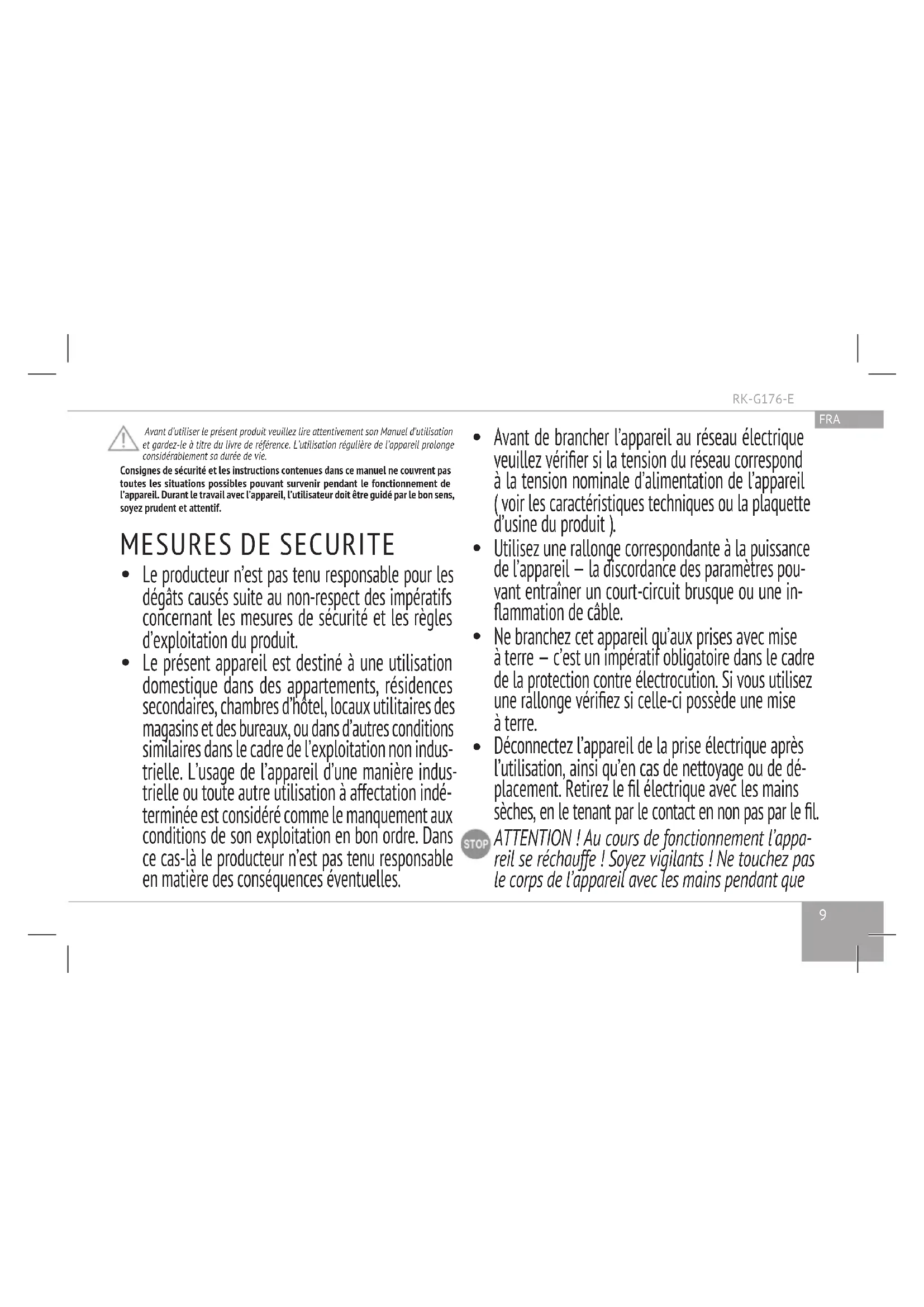 Cet appareil peut être utilisé par des enfants de 8ans et plus, ainsi que par des personnes dont les capacités physiques ou mentales sont réduites ou des personnes sans expérience ou sans connaissance, uniquement si elles ont pu bénécier d’une surveil- lance ou d’une instruction préalables concernantRK-G176-E