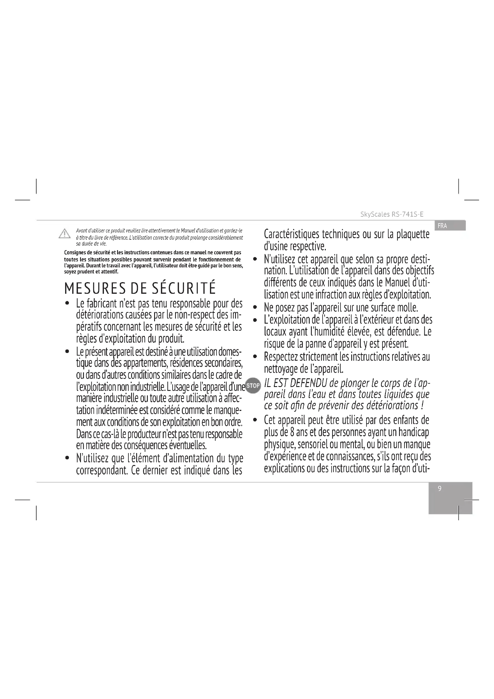 La réparation de l’appareil réalisée par ses propres soins ou des modications quelconques de sa structure sont interdites. Tous les travaux de main- tenance sont à exécuter par le Centre de services agrée. Un travail incompétent peut entraîner une panne de l’appareil, des accidents ou la détériora- tion des biens. ATTENTION ! Il est défendu d’utiliser cet ap- pareil en cas des détériorations quelconques. Caractéristiques techniques Моdèle ...........................................................................................................SkyScales RS-741S-E Alimentation...........................................................................................................................3 × ААА Tension nominale..............................................................................................................4,5 V Plage de pesée ...................................................................................................................2-5000 g Intervalle de mesure ....................................................................................................................1 g Nombre des capteurs ultrasensibles ........................................................................................... 4 Type de contrôle ......................................................................................................................tactile Écran LCD ........................................................................................................ avec rétro-éclairage Choix d’unité de pesée .............................................................................................................. g/oz Afchage de surcharge................................................................................................................ oui Minuterie intégrée .........................................................................................avec signale sonore Transfert de données ............................................................................................. Bluetooth v4.0 Support des systèmes d’exploitation ..................................................................... iOS, Android Fonction de déclenchement automatique ....................................................après 5 minutes Dimensions ..................................................................................................251 × 151 × 18,5 mm Poids net (sans batterie) ........................................................................................................ 520 g Fonctions disponibles lors d’utilisation de l’application Ready For Sky : Рesée progressive ......................................................................................................................... oui Sélection de produits...................................................................................................................oui Dénition de la valeur énergétique des aliments .............................................................. oui Dénition de la valeur nutritive des aliments ..................................................................... oui Composants Balance de cuisine .................................................................................................................1 pièce Élément d’alimentation AAA ...............................................................................................3 pièce Manuel d’utilisation ..............................................................................................................1 pièce Сarnet de service ...................................................................................................................1 pièce Le Fabricant a le droit de modier le design, les composants et les caractéristiques techniques d’un article en vue de perfectionnement de sa production sans l’avis préalable sur ces modications. Les caractéristiques techniques permettent une erreur de ±10%. Structure du modèle (schéma