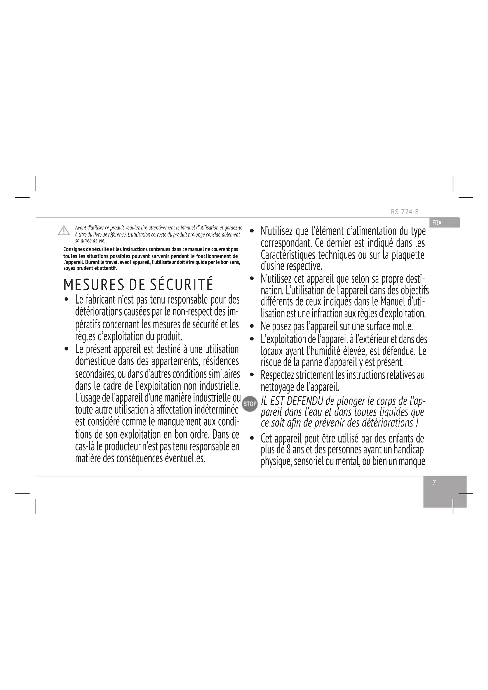 Le fabricant n’est pas tenu responsable pour des détériorations causées par le non-respect des im- pératifs concernant les mesures de sécurité et les règles d’exploitation du produit.