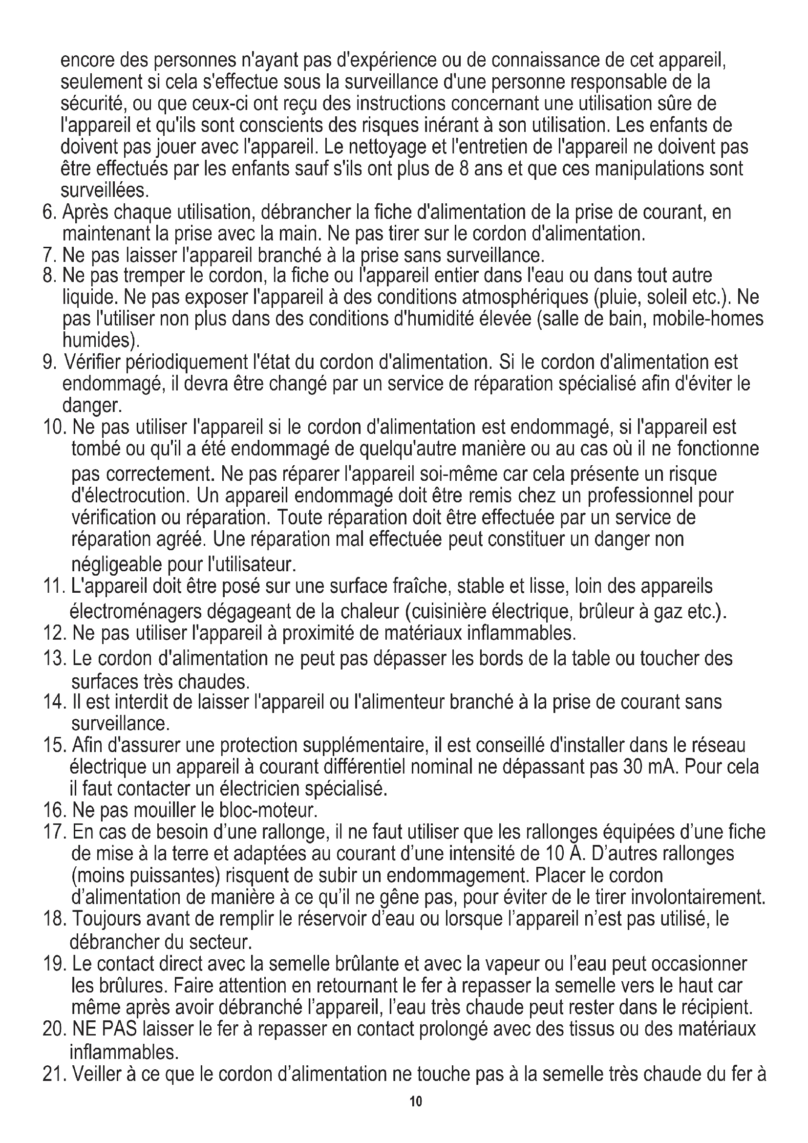 10. Ne pas utiliser l'appareil si le cordon d'alimentation est endommagé, si l'appareil est