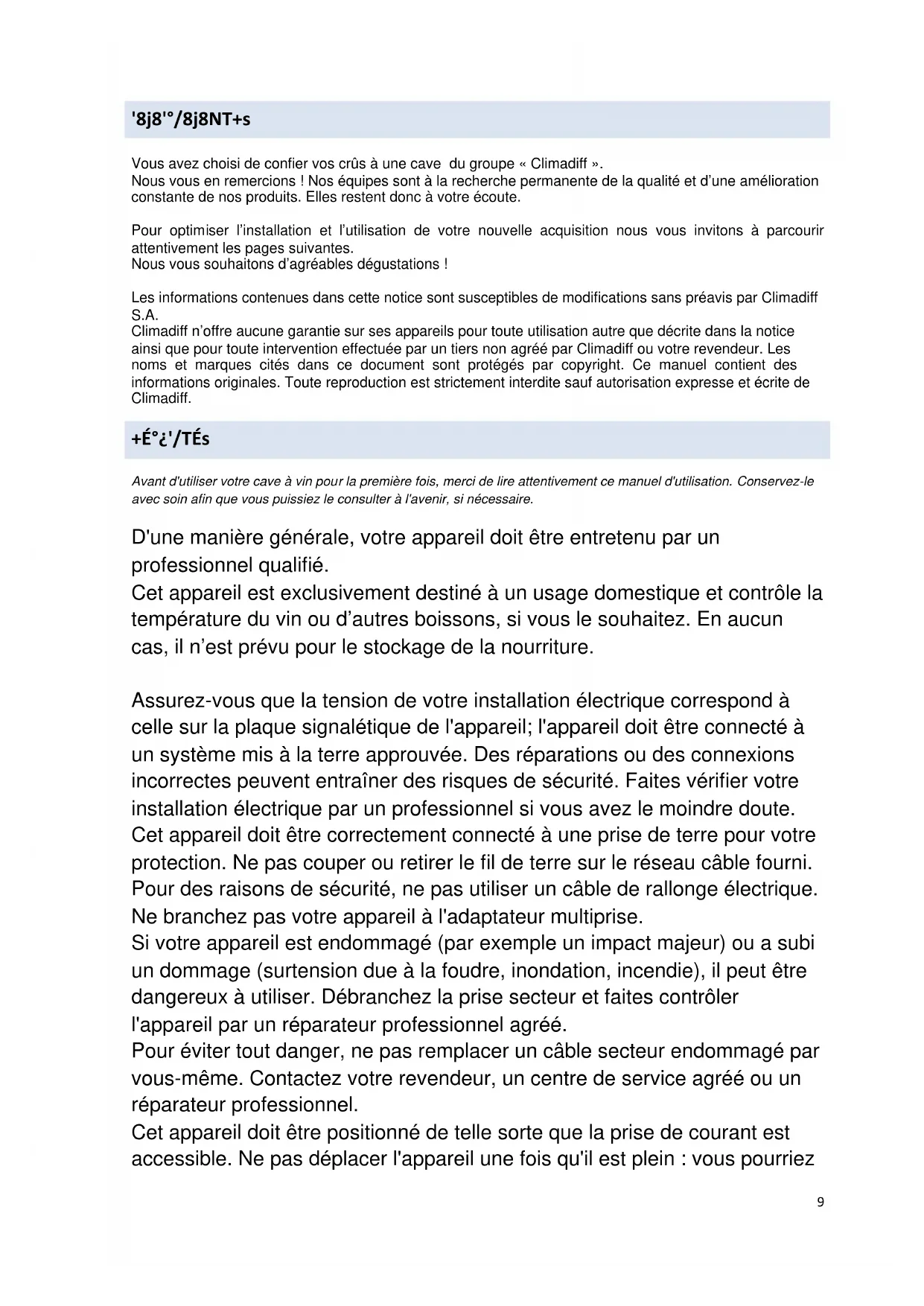 REMERCIEMENTS Vous avez choisi de confier vos crûs à une cave du groupe « Climadiff ». Nous vous en remercions ! Nos équipes sont à la recherche permanente de la qualité et d’une amélioration constante de nos produits. Elles restent donc à votre écoute. Pour optimiser l’installation et l’utilisation de votre nouvelle acquisition nous vous invitons à parcourir attentivement les pages suivantes. Nous vous souhaitons d’agréables dégustations ! Les informations contenues dans cette notice sont susceptibles de modifications sans préavis par Climadiff S.A. Climadiff n’offre aucune garantie sur ses appareils pour toute utilisation autre que décrite dans la notice ainsi que pour toute intervention effectuée par un tiers non agréé par Climadiff ou votre revendeur. Les noms et marques cités dans ce document sont protégés par copyright. Ce manuel contient des informations originales. Toute reproduction est strictement interdite sauf autorisation expresse et écrite de Climadiff. SÉCURITÉ Avant d'utiliser votre cave à vin pour la première fois, merci de lire attentivement ce manuel d'utilisation. Conservez-le avec soin afin que vous puissiez le consulter à l'avenir, si nécessaire. D'une manière générale, votre appareil doit être entretenu par un professionnel qualifié. Cet appareil est exclusivement destiné à un usage domestique et contrôle la température du vin ou d’autres boissons, si vous le souhaitez. En aucun cas, il n’est prévu pour le stockage de la nourriture. Assurez-vous que la tension de votre installation électrique correspond à celle sur la plaque signalétique de l'appareil; l'appareil doit être connecté à un système mis à la terre approuvée. Des réparations ou des connexions incorrectes peuvent entraîner des risques de sécurité. Faites vérifier votre installation électrique par un professionnel si vous avez le moindre doute. Cet appareil doit être correctement connecté à une prise de terre pour votre protection. Ne pas couper ou retirer le fil de terre sur le réseau câble fourni. Pour des raisons de sécurité, ne pas utiliser un câble de rallonge électrique. Ne branchez pas votre appareil à l'adaptateur multiprise. Si votre appareil est endommagé (par exemple un impact majeur) ou a subi un dommage (surtension due à la foudre, inondation, incendie), il peut être dangereux à utiliser. Débranchez la prise secteur et faites contrôler l'appareil par un réparateur professionnel agréé. Pour éviter tout danger, ne pas remplacer un câble secteur endommagé par vous-même. Contactez votre revendeur, un centre de service agréé ou un réparateur professionnel. Cet appareil doit être positionné de telle sorte que la prise de courant est accessible. Ne pas déplacer l'appareil une fois qu'il est plein : vous pourriez3 déformer son corps au-delà de la réparation. Les composants électriques ne doivent pas être directement accessibles.
