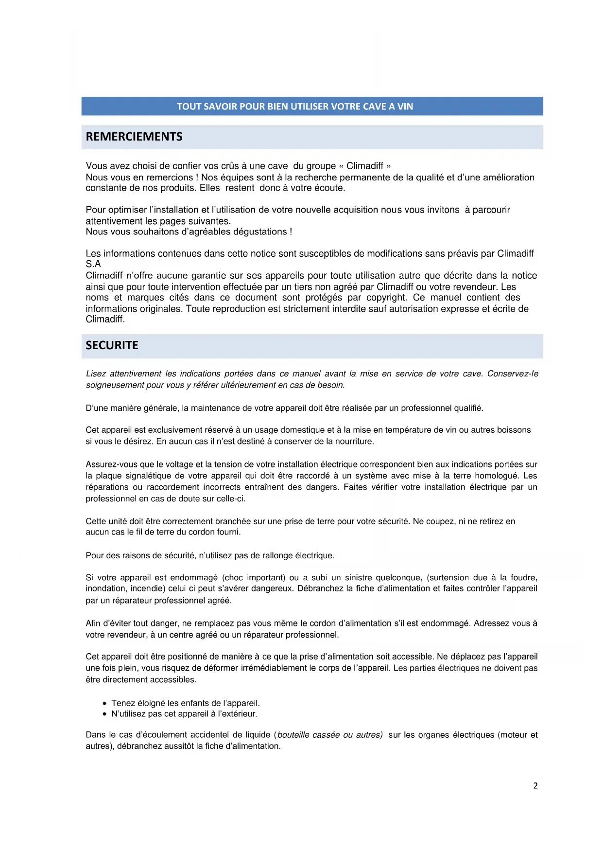 TOUT SAVOIR POUR BIEN UTILISER VOTRE CAVE A VIN REMERCIEMENTS Vous avez choisi de confier vos crûs à une cave du groupe « Climadiff » Nous vous en remercions ! Nos équipes sont à la recherche permanente de la qualité et d’une amélioration constante de nos produits. Elles restent donc à votre écoute. Pour optimiser l’installation et l’utilisation de votre nouvelle acquisition nous vous invitons à parcourir attentivement les pages suivantes. Nous vous souhaitons d’agréables dégustations ! Les informations contenues dans cette notice sont susceptibles de modifications sans préavis par Climadiff S.A Climadiff n’offre aucune garantie sur ses appareils pour toute utilisation autre que décrite dans la notice ainsi que pour toute intervention effectuée par un tiers non agréé par Climadiff ou votre revendeur. Les noms et marques cités dans ce document sont protégés par copyright. Ce manuel contient des informations originales. Toute reproduction est strictement interdite sauf autorisation expresse et écrite de Climadiff. SECURITE Lisez attentivement les indications portées dans ce manuel avant la mise en service de votre cave. Conservez-le soigneusement pour vous y référer ultérieurement en cas de besoin. D’une manière générale, la maintenance de votre appareil doit être réalisée par un professionnel qualifié. Cet appareil est exclusivement réservé à un usage domestique et à la mise en température de vin ou autres boissons si vous le désirez. En aucun cas il n’est destiné à conserver de la nourriture. Assurez-vous que le voltage et la tension de votre installation électrique correspondent bien aux indications portées sur la plaque signalétique de votre appareil qui doit être raccordé à un système avec mise à la terre homologué. Les réparations ou raccordement incorrects entraînent des dangers. Faites vérifier votre installation électrique par un professionnel en cas de doute sur celle-ci. Cette unité doit être correctement branchée sur une prise de terre pour votre sécurité. Ne coupez, ni ne retirez en aucun cas le fil de terre du cordon fourni. Pour des raisons de sécurité, n’utilisez pas de rallonge électrique. Si votre appareil est endommagé (choc important) ou a subi un sinistre quelconque, (surtension due à la foudre, inondation, incendie) celui ci peut s’avérer dangereux. Débranchez la fiche d’alimentation et faites contrôler l’appareil par un réparateur professionnel agréé. Afin d’éviter tout danger, ne remplacez pas vous même le cordon d’alimentation s’il est endommagé. Adressez vous à votre revendeur, à un centre agréé ou un réparateur professionnel. Cet appareil doit être positionné de manière à ce que la prise d’alimentation soit accessible. Ne déplacez pas l’appareil une fois plein, vous risquez de déformer irrémédiablement le corps de l’appareil. Les parties électriques ne doivent pas être directement accessibles. Tenez éloigné les enfants de l’appareil. N’utilisez pas cet appareil à l’extérieur. Dans le cas d’écoulement accidentel de liquide (bouteille cassée ou autres) sur les organes électriques (moteur et autres), débranchez aussitôt la fiche d’alimentation.3